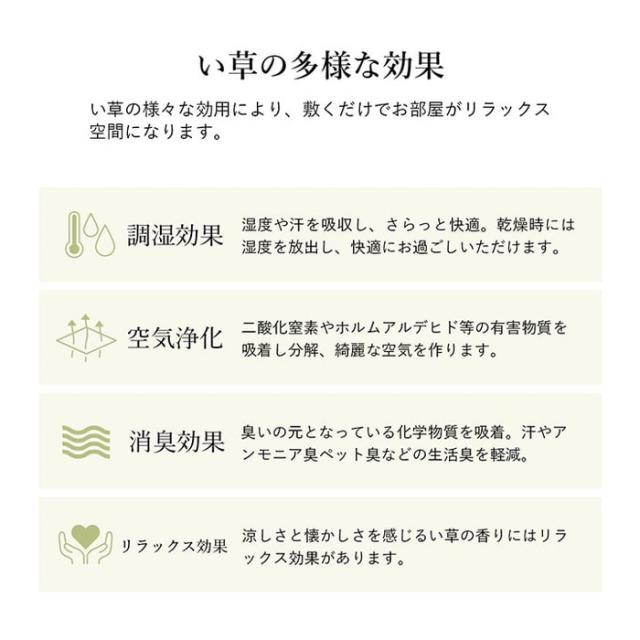 | 素材 | 表地=い草※普通織 中材=ウレタン5mm 裏地=ポリエステル100%【滑り止め不織布】 ヘリ=ポリエステル100% |