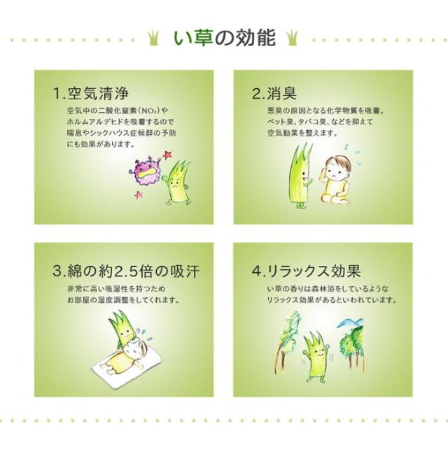 | 素材 | 側地=い草(※メセキ織) 中材=固綿(ポリエステル)15mm ヘリ=綿100% 裏地=い草(※メセキ織) |
