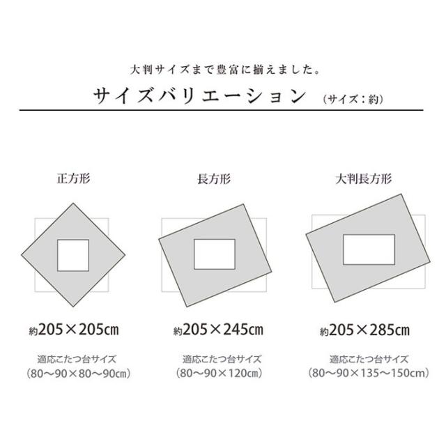 | 商品説明 | シンプルなリーフ柄をあしらった商品です。表地には肌触りやわらかなフランネルを使用しました。部分暖房のこたつは電気代もお得です。洗濯表示:40℃以下の水温で、弱い手洗いがよい。(洗濯機は使用できない)適応サイズ:80〜90×135〜150cm幅のこたつ台に適応 |