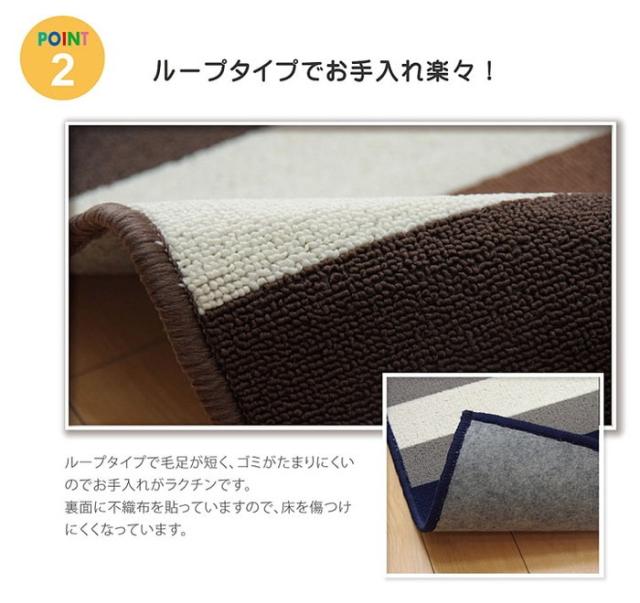 販売実績3万枚の人気デスクカーペット。子供が成長しても使いやすいカラー展開で長くお使いいただけます。デザインもシンプルなボーダー柄で使いやすく、大人のテレワーク用デスクの下にも敷けます。裏面は不織布だから学習机や椅子の移動も安心。床の傷防止には必要なアイテムです。表面はループタイプで毛足が短いからゴミもたまりにくくお手入れも簡単。またポリプロピレン糸を使用しているから摩擦に強く、毛玉が出にくいのも特徴です。厚みは5mmと薄いため、椅子の移動やお子様が歩く際もつまずきにくくお掃除ロボットも上り下りできるためお掃除もラクラクです。ルームマットとしてキッズルームやベッドサイドにもお使いいただけます。大きいサイズは2人用のダイニングカーペットとしてもお使いいただけます。丸巻きタイプでお届けしているため、折りシワの心配もなくキレイに敷くことがで