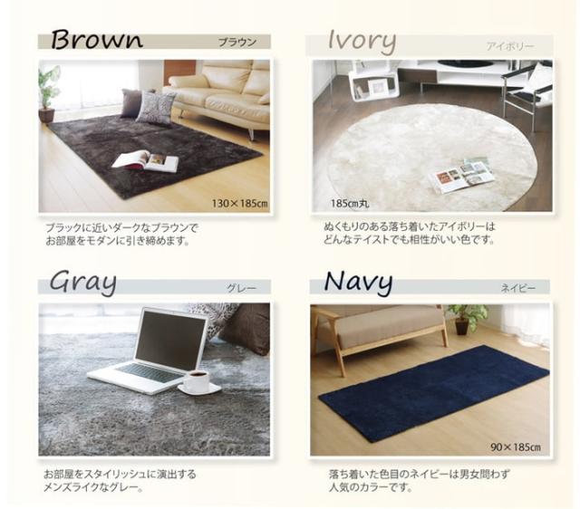 お部屋に合わせやすい高級感あふれるオーバーロック仕様のラグです。シャギー調の毛足は約18mmでふかふかとした感触とさらさらとした肌触りがとても気持ちいい商品です。オールシーズンご使用いただけます。裏面には滑りにくい加工を施しているためフローリングでも安心してご使用いただけます。ホットカーペット・床暖房対応です。ホルムアルデヒド試験の乳幼児用品基準をクリア。小さなお子様にも安心して使えるノンホルムアルデヒド製品です。8色・7サイズの多色・多サイズ展開のため、お部屋に合った色やサイズをお選びいただけます。洗濯表示:30℃以下の水温で洗濯機の弱水流もしくは弱い手洗いができます。(洗濯時は洗濯ネットをご使用ください。)干し方=日陰のつり干しがよい。