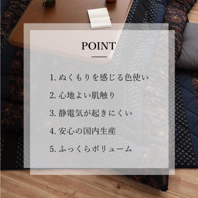 和モダン柄のこたつ布団です。熱が逃げにくいフィットキルト加工を施しています。生地に撥水加工を施しています。生地には肉厚で張りと光沢のある綿素材を使用しています。こちらの商品は国内でプリント、綿入れしています。日本製のプリントらしい上質な質感と繊細な文様をお楽しみ下さい。部分暖房のこたつは電気代もおトクです。洗濯表示:40℃以下の水温で弱い手洗いで洗濯してください。(洗濯機は使用できません。) 干し方=日陰のつり干しがよい。適応サイズ:80〜90cm角のこたつ台に適応