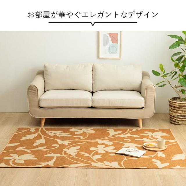 ボタニカルテイストのおしゃれなカーペット。お子様用のデスクカーペットはもちろん、大人用の書斎やテレワークデスクにもおすすめです。表地に撥水加工を施しているので、水分をこぼしてもサッと拭けてお手入れ簡単。裏面は不織布だから学習机や椅子の移動も安心。床の傷防止に必要なアイテムです。表面はループタイプで毛足が短いので、ゴミもたまりにくくお手入れも簡単。またポリプロピレン糸を使用しているから摩擦に強く、毛玉が出にくいのも特徴です。厚みは5mmと薄いため、椅子の移動やお子様が歩く際もつまずきにくく安心してお使いいただけます。ルームマットとしてキッズルームやベッドサイドに敷いたり、大きいサイズは2人用のダイニングカーペットとしてもお使いいただけます。丸巻きでお届けするため、折りシワの心配もなくキレイに敷くことができます。洗濯表示:30℃以下の水温で弱い手洗いで洗濯