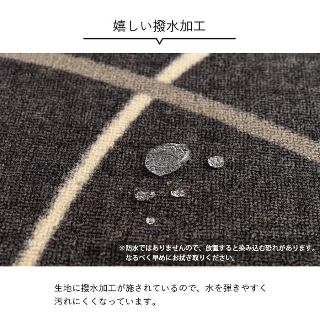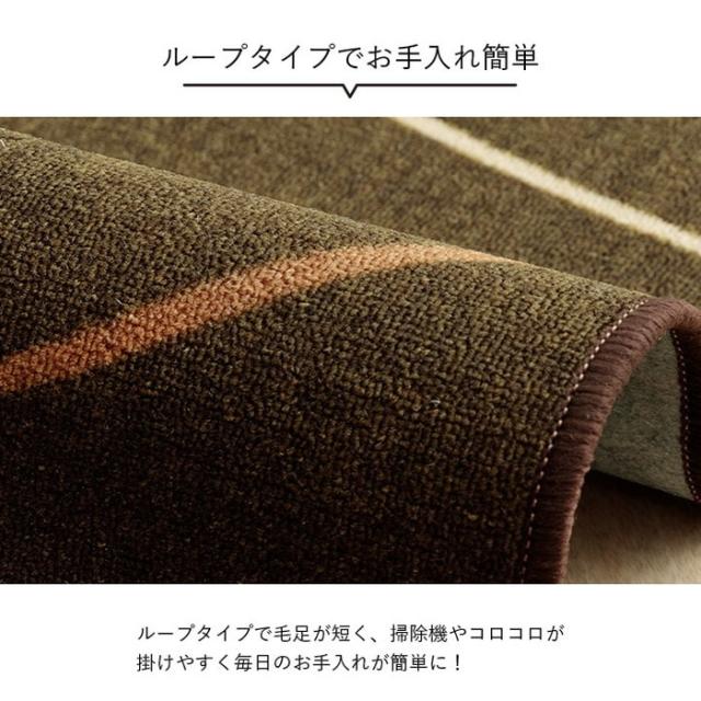 モダンなライン柄のカーペット。お子様用のデスクカーペットはもちろん、大人用の書斎やテレワークデスクにもおすすめです。表地に撥水加工を施しているので、水分をこぼしてもサッと拭けてお手入れ簡単。裏面は不織布だから学習机や椅子の移動も安心。床の傷防止に必要なアイテムです。表面はループタイプで毛足が短いので、ゴミもたまりにくくお手入れも簡単。またポリプロピレン糸を使用しているから摩擦に強く、毛玉が出にくいのも特徴です。厚みは5mmと薄いため、椅子の移動やお子様が歩く際もつまずきにくく安心してお使いいただけます。ルームマットとしてキッズルームやベッドサイドに敷いたり、大きいサイズは2人用のダイニングカーペットとしてもお使いいただけます。丸巻きでお届けするため、折りシワの心配もなくキレイに敷くことができます。洗濯表示:30℃以下の水温で弱い手洗いで洗濯してください
