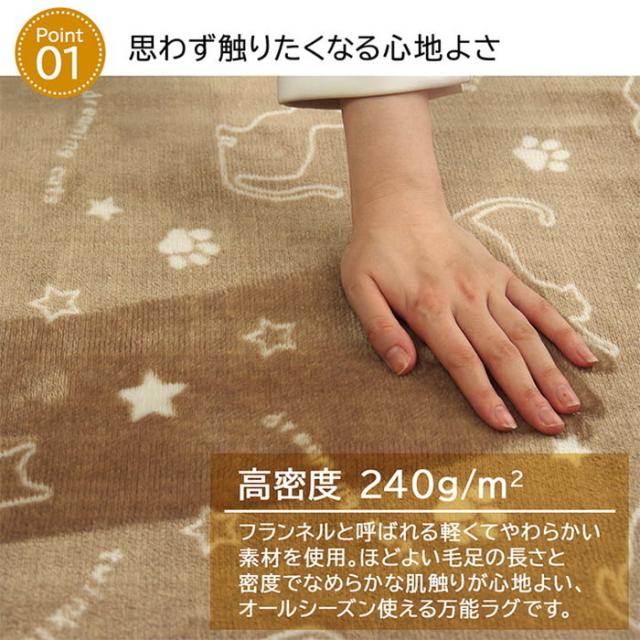 生地に抗菌・防臭加工を施した,ラグカーペットです。表地にはフランネルと呼ばれる,しっとりとして非常に柔らかい生地を使用しています。軽量で持ち運びが楽々です。薄手で小さく折りたたむことができますので,収納時にも場所を取りません。フローリングを傷つけにくいよう,裏には不織布を貼っています。ご家庭の洗濯機で洗えるウォッシャブル仕様ですので,清潔にご使用頂けます。電気カーペットカバーとしてもご使用頂けます。季節を選ばすオールシーズンご使用頂けます。多サイズ展開で,ワンルームから子ども部屋,リビング・ダイニング,ベッドサイド,ソファ前にも。いろいろなシーンに合わせてお選び下さい。※ 掲載写真は表記サイズと異なる場合がございます。※ 画面上のカラーはご使用ブラウザやモニターの設定により,実物とは若干異な