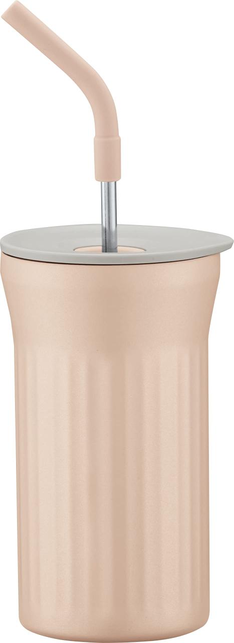 真空二重構造で冷たさ長持ち。デスクワークをしながらでも飲みやすいストロータイプ。シリ コーン製の飲み口で口当たりがやさしい。氷もしっかり入る広口タイプ(口径約7.7cm)。倒してもこぼれにくい専用のフタ付き。
