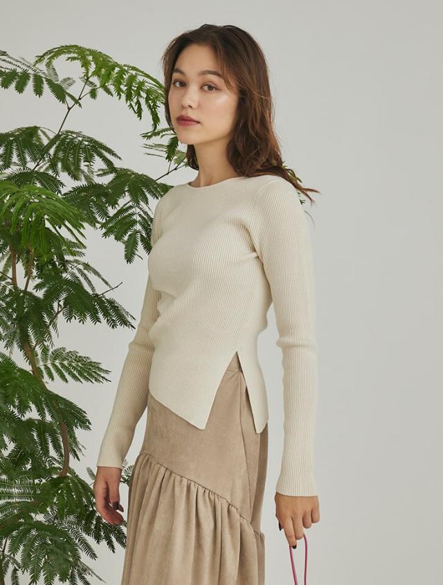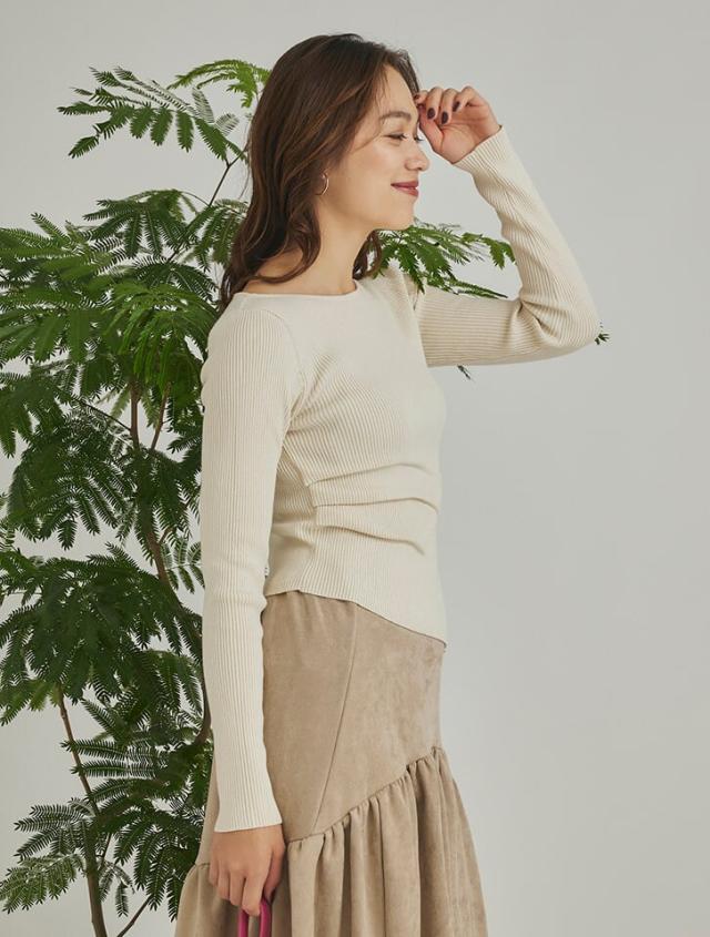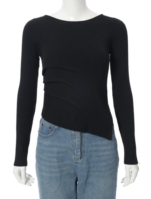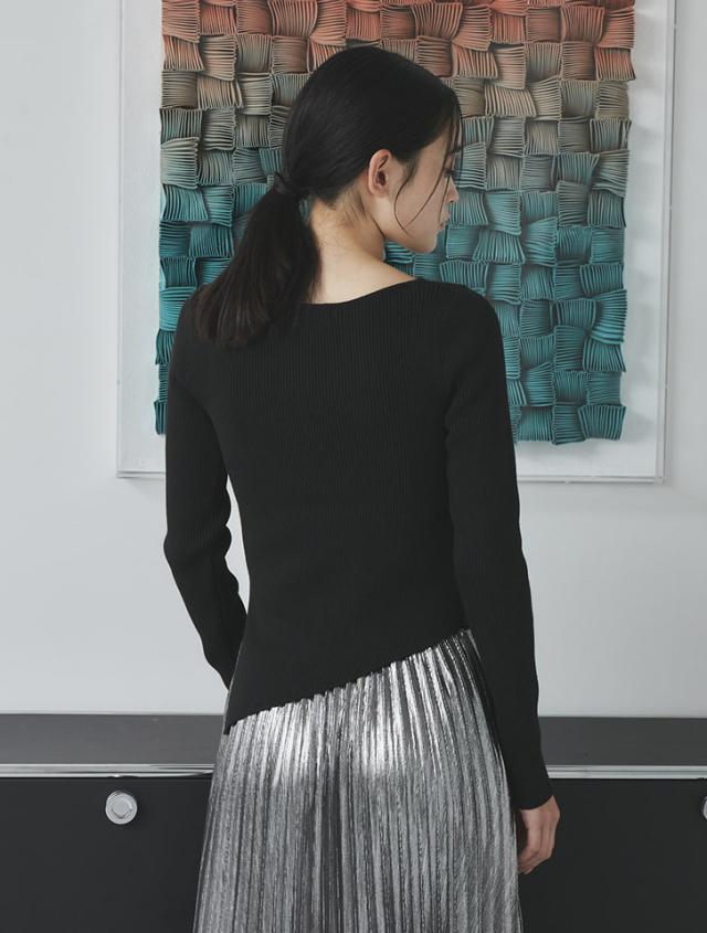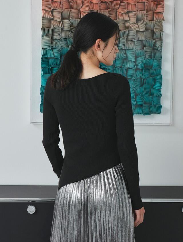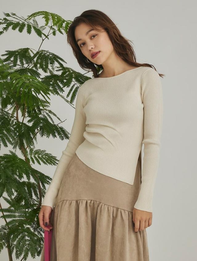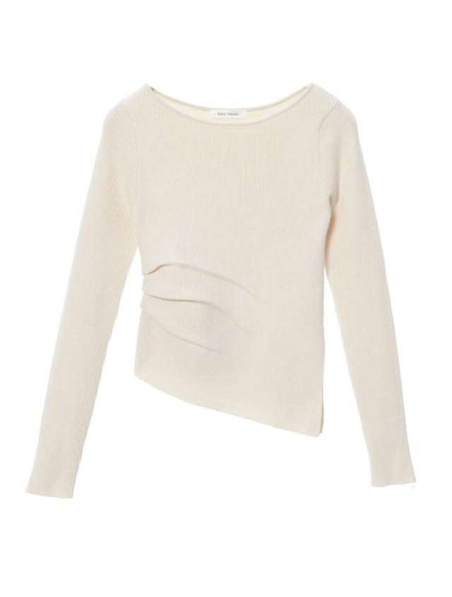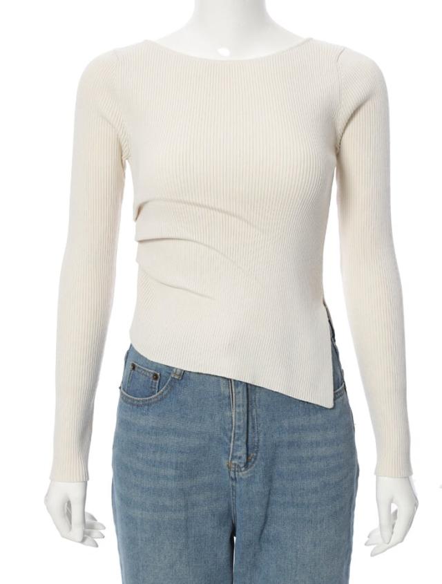 アシンメトリーなヘムデザインが印象的なリブニット。程よくボディにフィットするすっきりとしたシルエットに、サイドに施したタックが立体感を演出します。パンツにもスカートにも合わせやすく、様々なスタイリングに活躍するアイテムです。