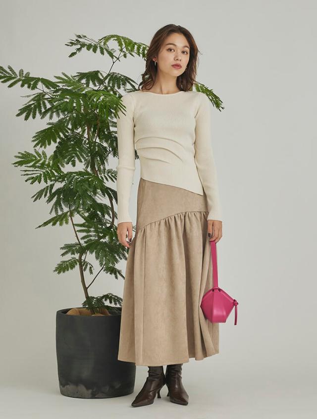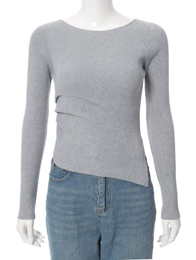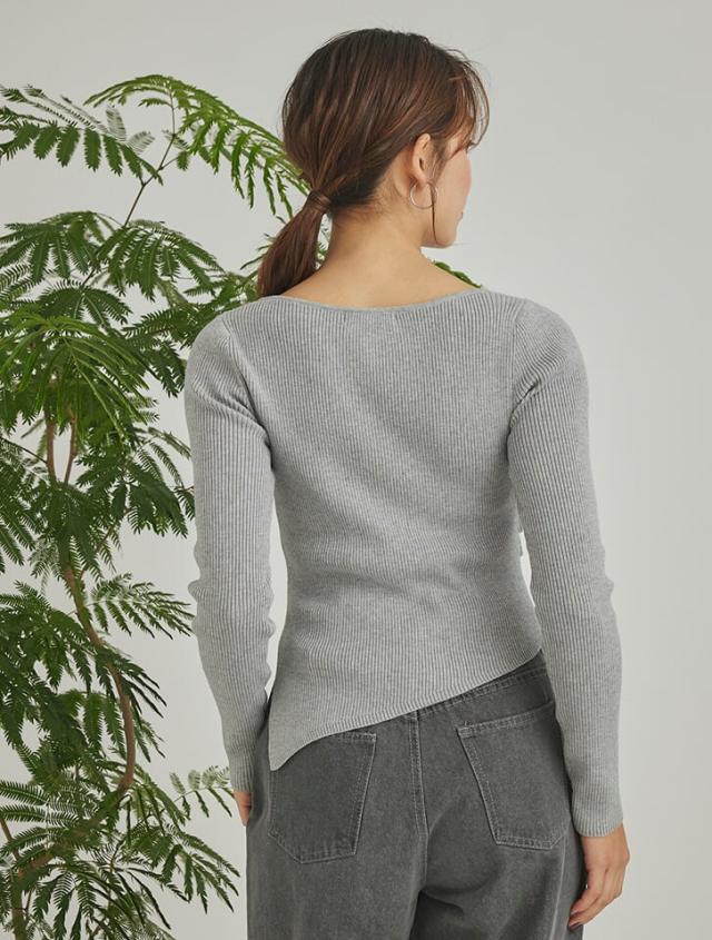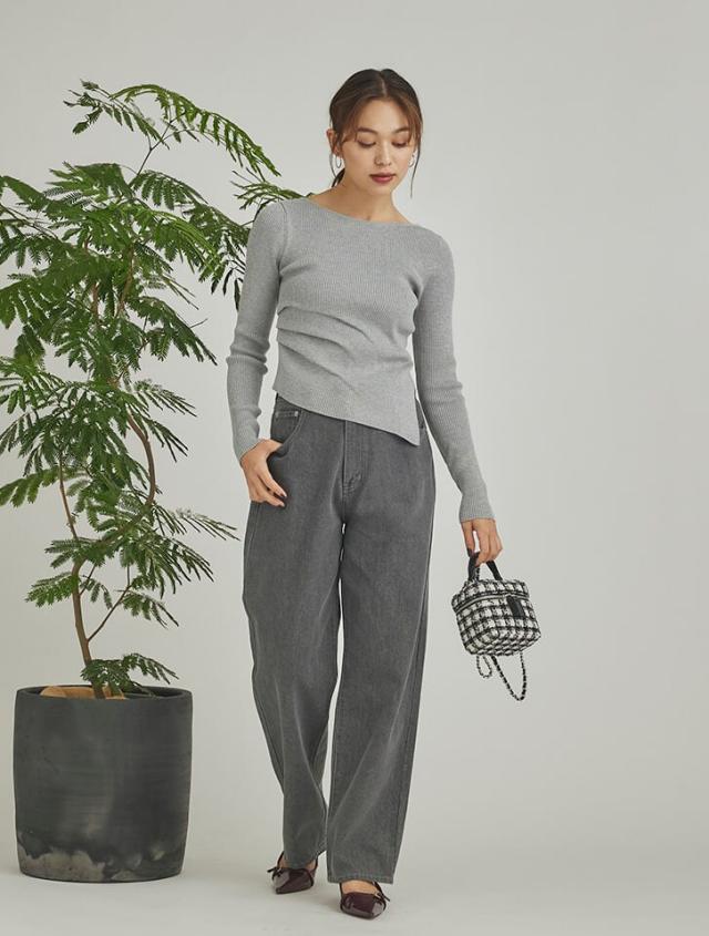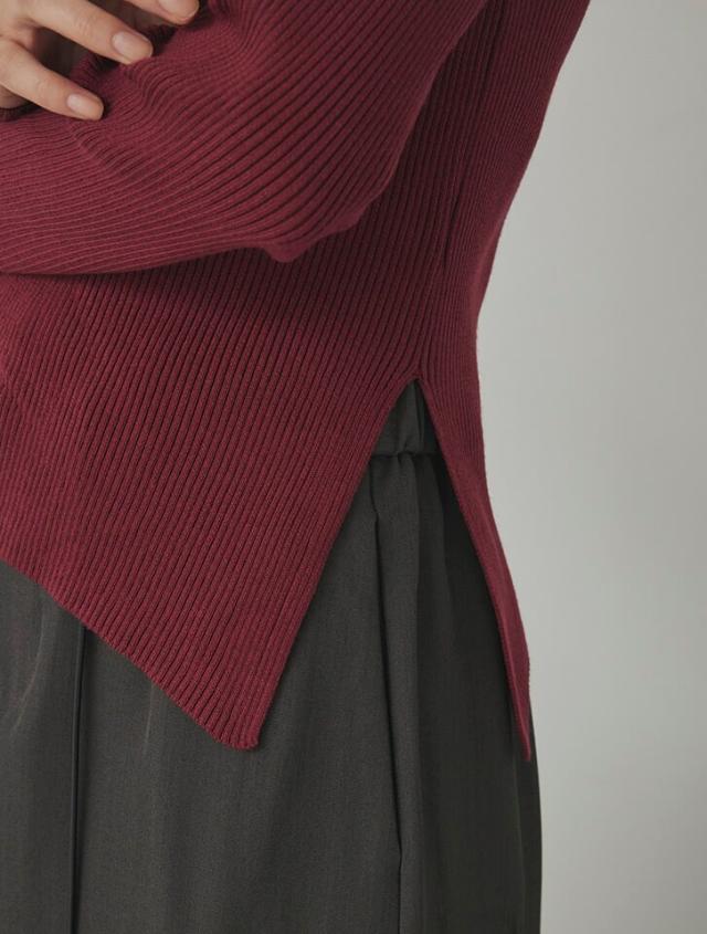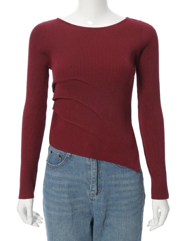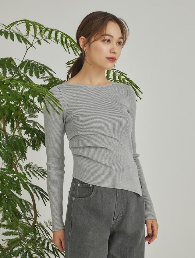 アシンメトリーなヘムデザインが印象的なリブニット。程よくボディにフィットするすっきりとしたシルエットに、サイドに施したタックが立体感を演出します。パンツにもスカートにも合わせやすく、様々なスタイリングに活躍するアイテムです。