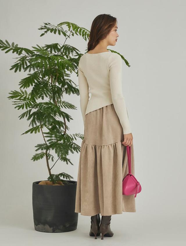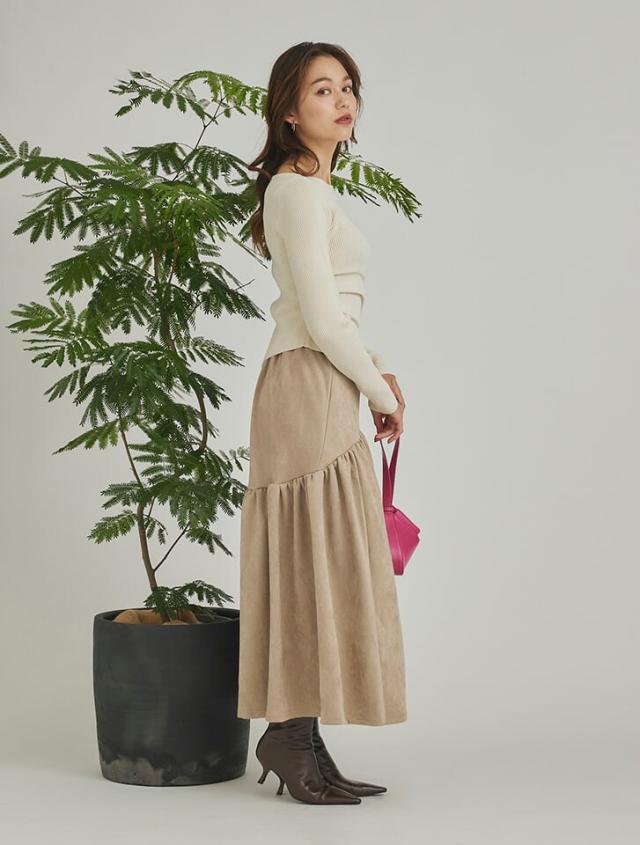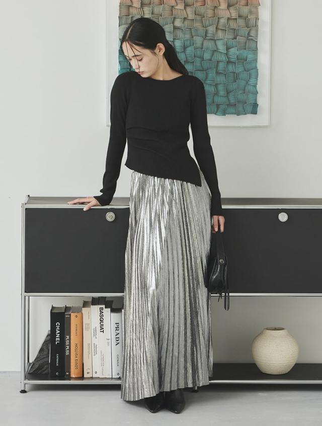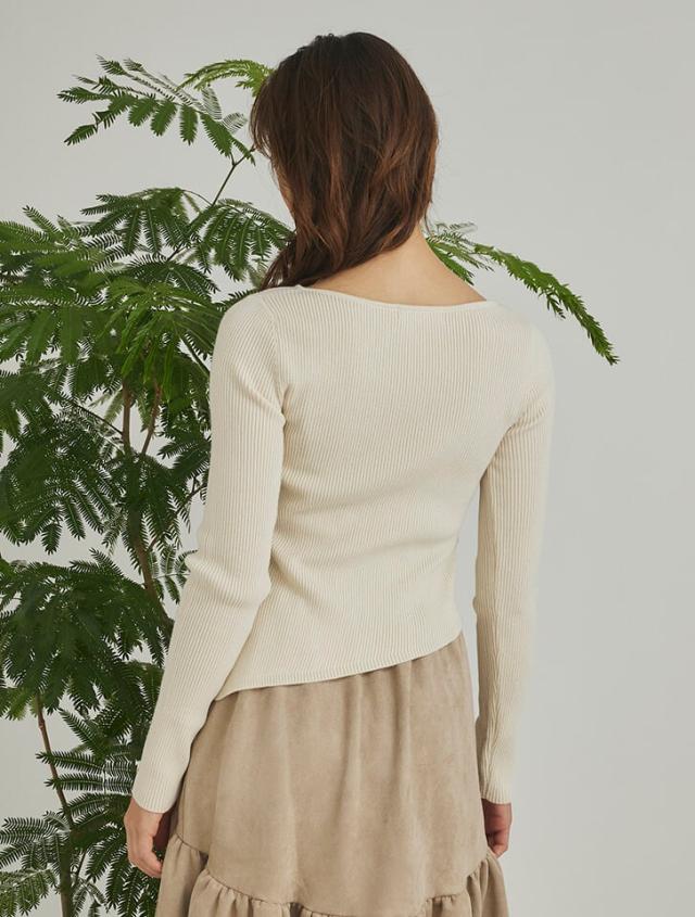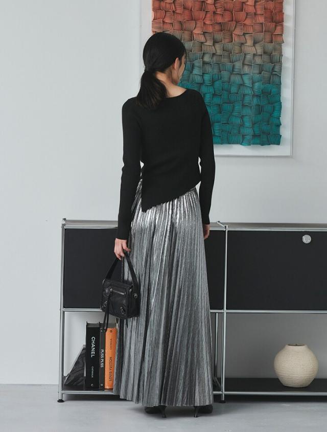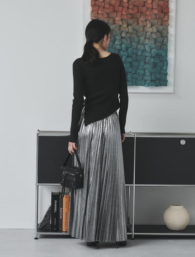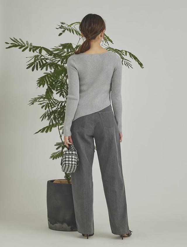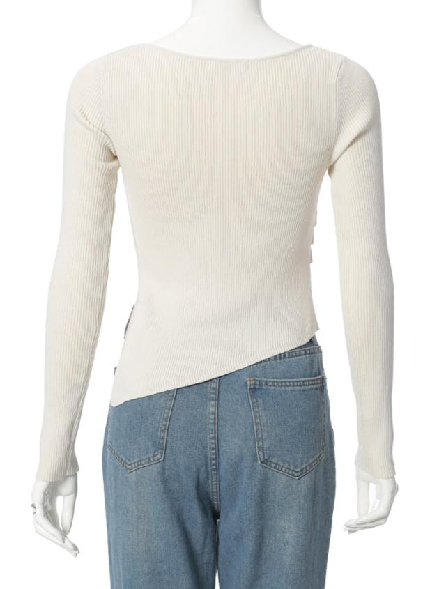 アシンメトリーなヘムデザインが印象的なリブニット。程よくボディにフィットするすっきりとしたシルエットに、サイドに施したタックが立体感を演出します。パンツにもスカートにも合わせやすく、様々なスタイリングに活躍するアイテムです。