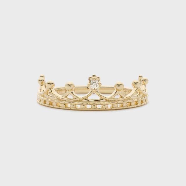 「〜Always wear your invisible crown〜誰もがいつも目には見えないクラウンを頭にのせている。下を向いたら落ちてしまうから、あなたらしく前を向いて。」レースで出来たクラウンをモチーフにしたリング。レースのような繊細な透かし装飾が指を取り巻き、クラシカルな印象。中央に煌めくダイヤモンドが存在感を放ち、指をすらりと美しく魅せてくれます。1本で程よい存在感がありながら手のひら側は細くなるようにデザインしているので、見た目より軽やかな着け心地。華奢なリングとの重ね着けも楽しめます。ロングセラーのクラウンリングがリニューアル。より軽やかに身に着けられるデザインにアップデートしています。※天然石や天然素材を使用しているものは、サイズ・色味・風合いの違いや、若干の傷、内包物の有無などに個体差があります。予めご了承ください。※サイズ直しプラスマイナス2号迄。