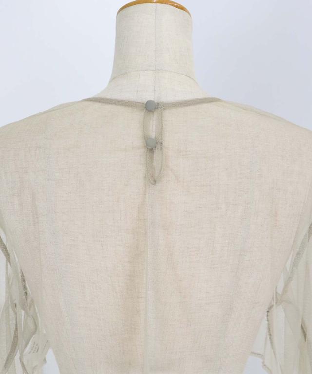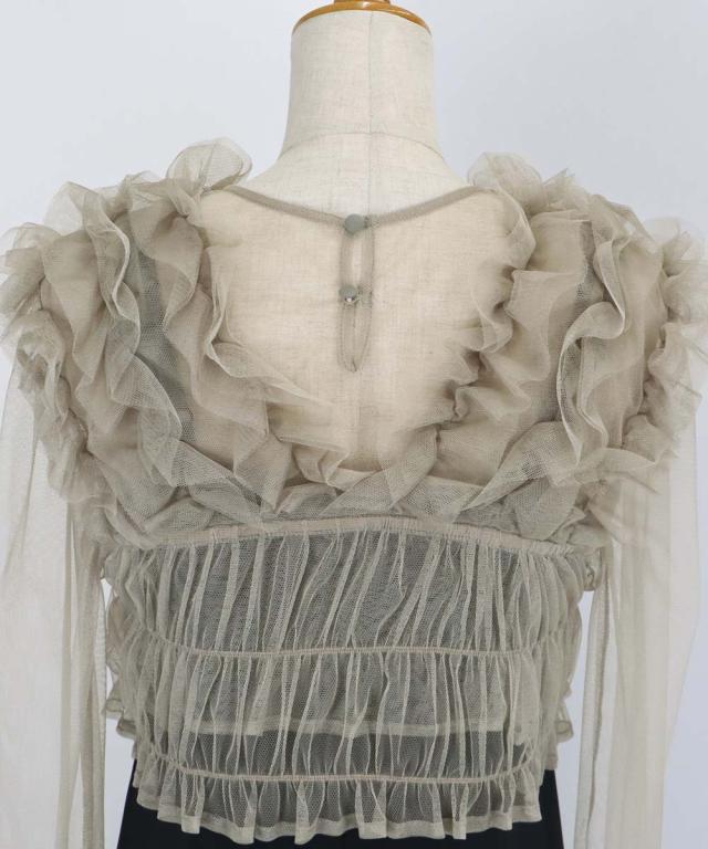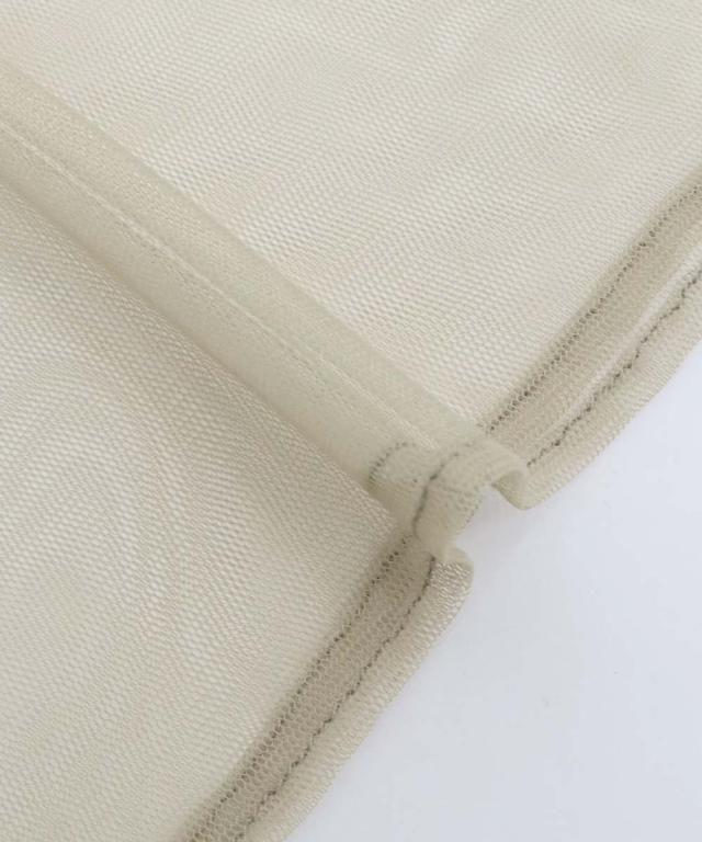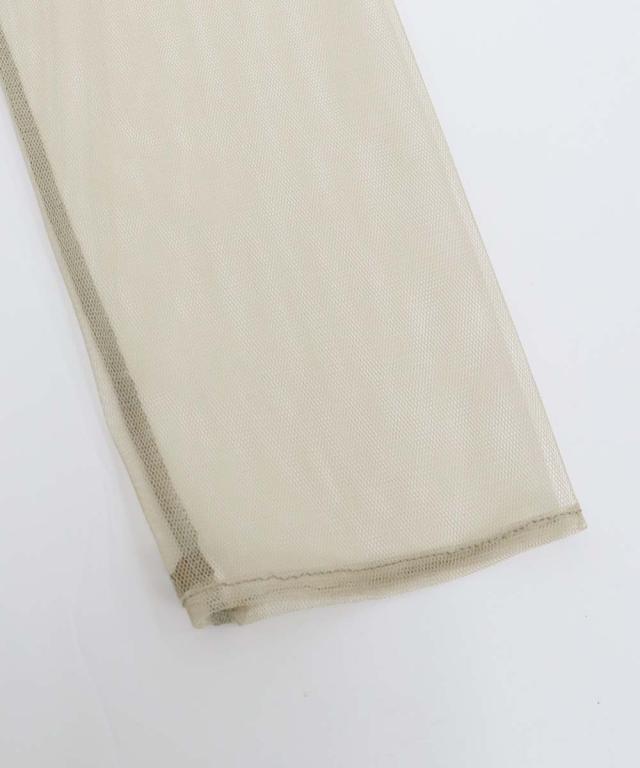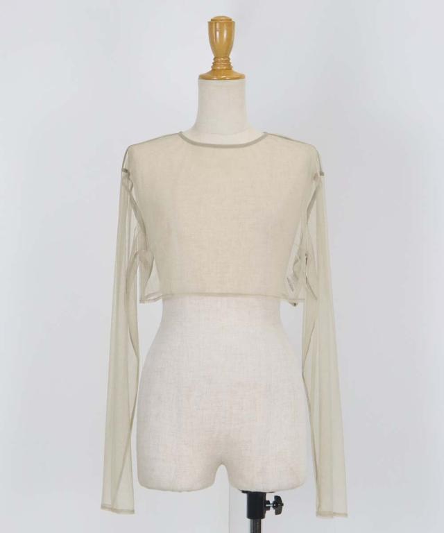 長袖のトップスは透け感の美しいチュール1枚仕立てで、装飾のないシンプルなシルエットなのでキャミワンピの中にレイヤードしても◎