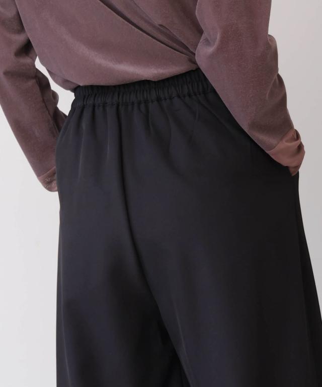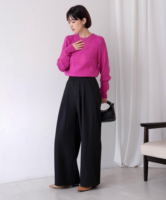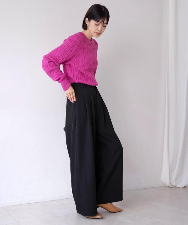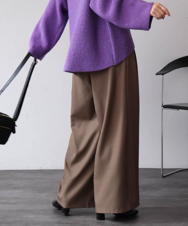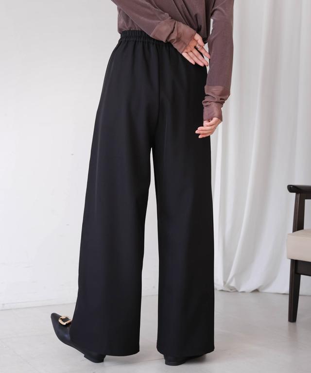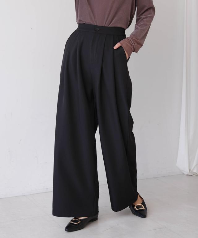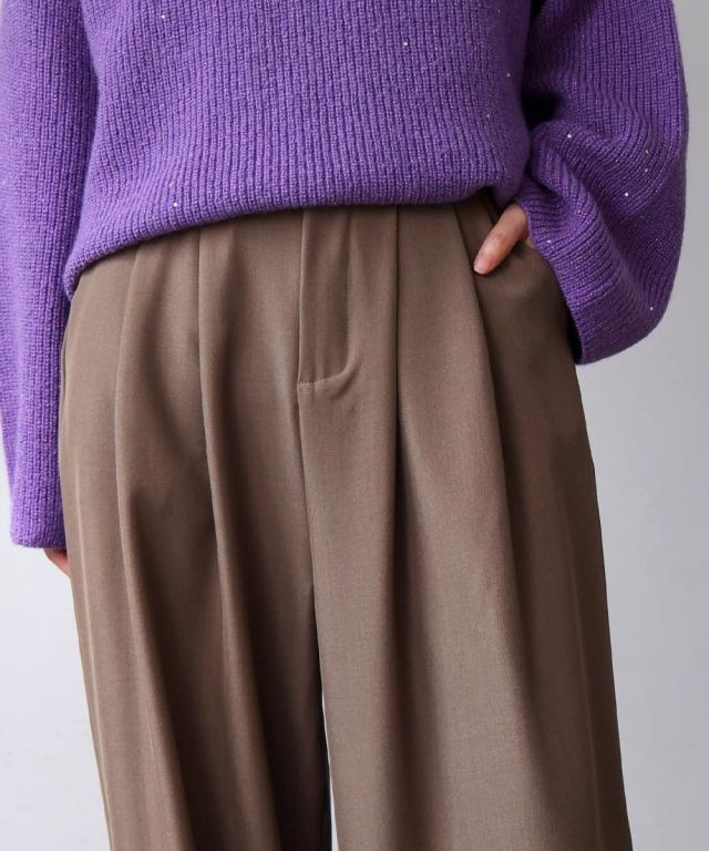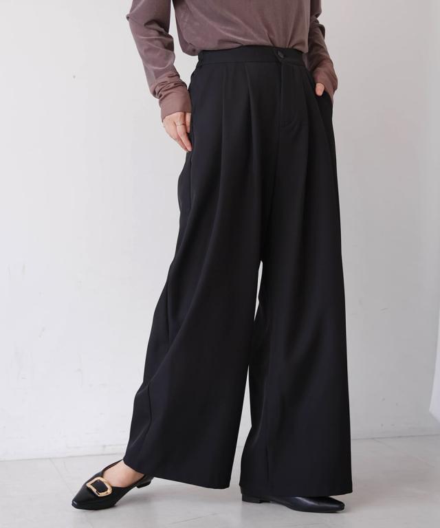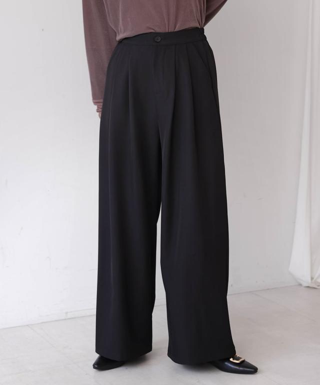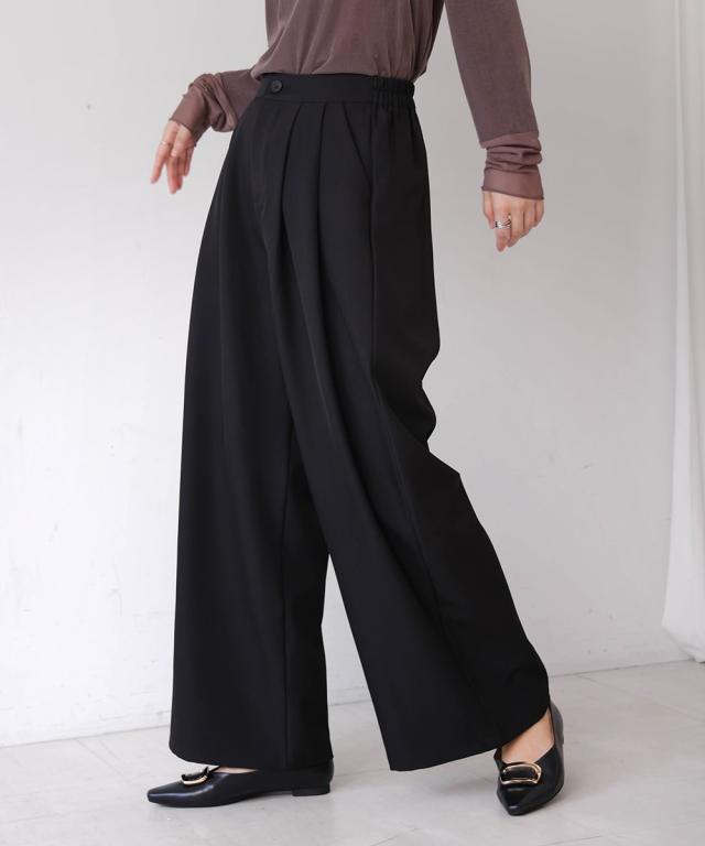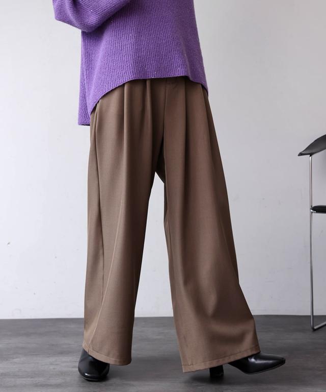 すっきりとしたラインとリラックス感を兼ね備えたタックワイドパンツ。ハンサムな印象の中に女性らしさが漂い、きちんと感を求める日にも活躍します。ウエスト部分に施されたタックが立体感を生み出し、腰回りをすっきり見せるデザインが特徴です。ワイドシルエットが足元を軽やかに演出しつつ、背中側はゴム仕様で快適な着心地を実現。両サイドには実用的なポケットを備え、オンオフ問わず活躍します。