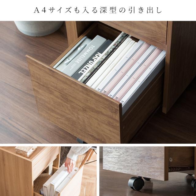 | 説明 | 色々収納できる引き出しが二杯付いたシンプルで美しい木目調のサイドチェスト『Lezele(ルゼル)』。デスク周りはもちろんリビングや寝室などお家の色々な場所でマルチに活躍します。 深さの異なる二つの引き出しはA4ファイルも収納できるサイズ。天板は囲いがあり書類やマグカップの落下を防げます。キャスター付きで移動もラクラク。 同シリーズのサイドラックや、同じ木目調のコの字型デスク『Visage Neo(ビサージュ ネオ)』と合わせるとより統一感があり便利にお使いいただけます。 |