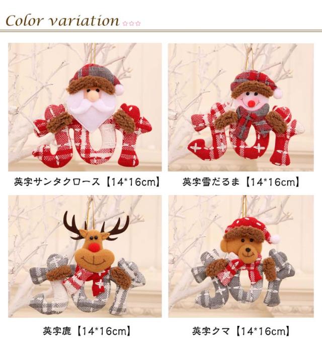 | 色 | 英字サンタクロース【14*16cm】 英字雪だるま【14*16cm】 英字鹿【14*16cm】 英字クマ【14*16cm】 足長鈴サンタクロース 【24×11cm】 足長鈴雪だるま【24×11cm】 足長鈴鹿【24×11cm】 足長鈴クマ【24×11cm】 |