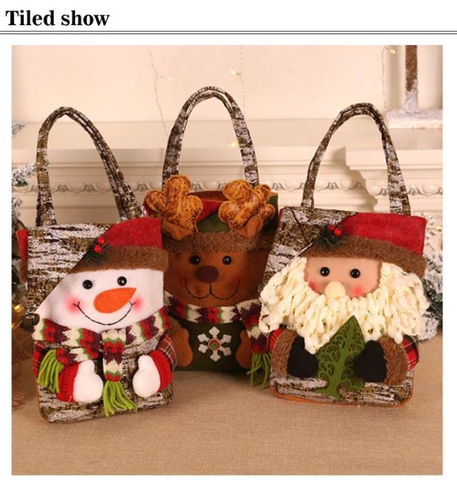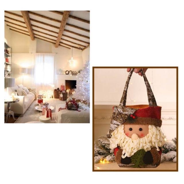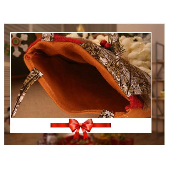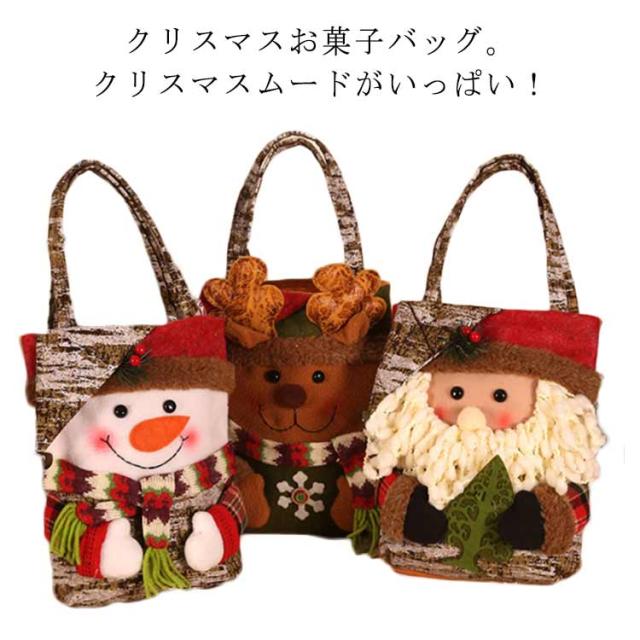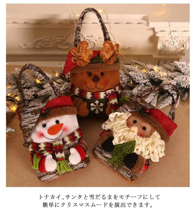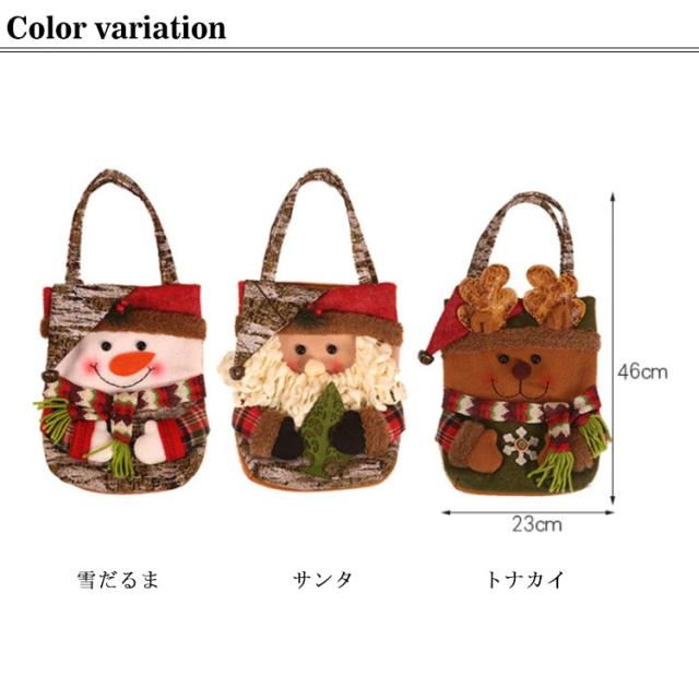 | クリスマスお菓子バッグ。クリスマスムードがいっぱい! トナカイ、サンタと雪だるまをモチーフにして簡単にクリスマスムードを演出できます。 プレゼントやお菓子を入れてお子さんに渡しても可愛いです。 にっこりとほほ笑む優しい表情に、帽子を被った姿が可愛らしいです。 背面には不織布生地で作られており、厚くて丈夫で壊れにくい。 | |