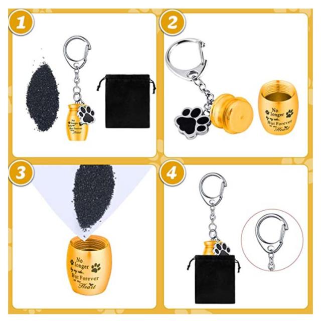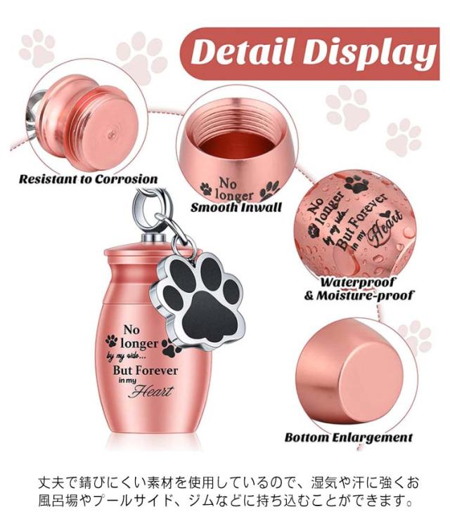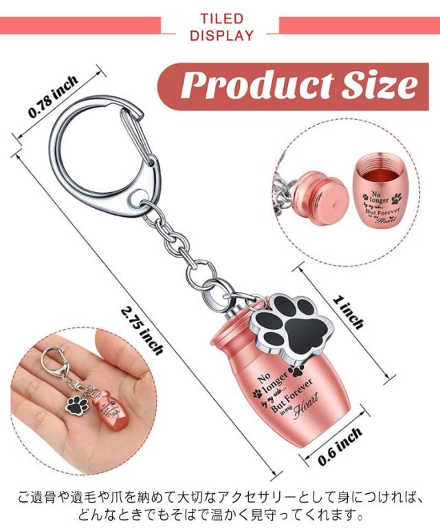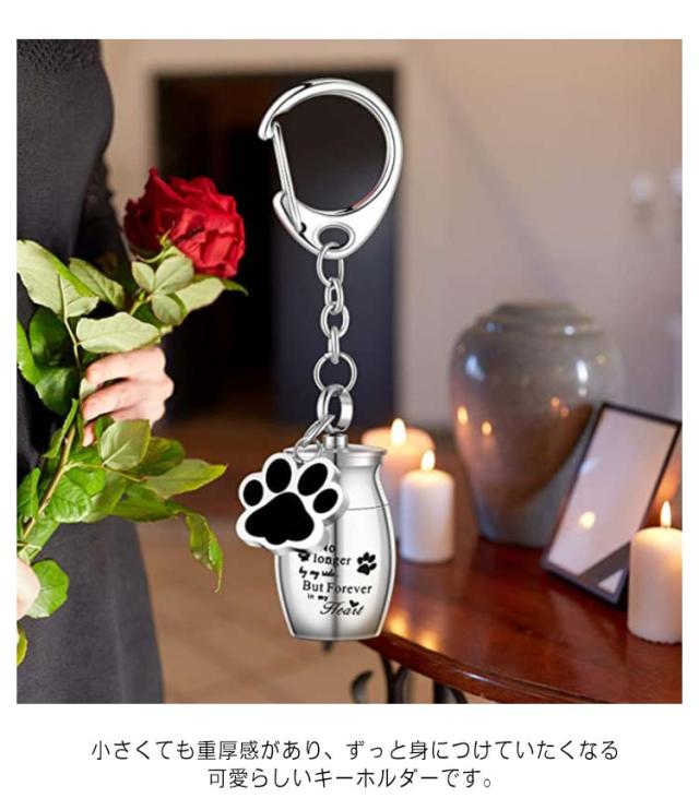 | 大切なペットの手元供養ができる骨壷キーホルダ ご遺骨や遺毛や爪を納めて大切なアクセサリーとして身につければ、どんなときでもそばで温かく見守ってくれます。 丈夫で錆びにくい素材を使用しているので、湿気や汗に強くお風呂場やプールサイド、ジムなどに持ち込むことができます。 小さくても重厚感があり、ずっと身につけていたくなる可愛らしいキーホルダーです。 ※パッキンはありませんので完全防水ではありません。 | |