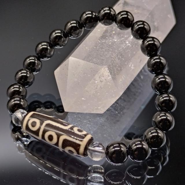 天珠の中でも最強のエネルギーを持つ九眼天珠。アクセントの橋渡しに水晶を組み合わせました。