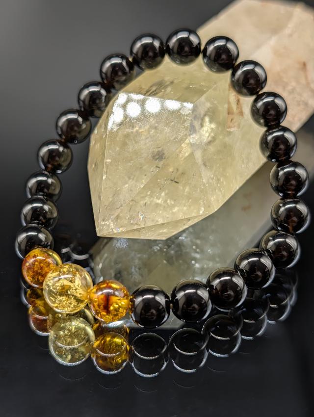 モリオンは、病気治癒効果があり、アンバーも内臓を修復・回復する効果があるので健康面で非常に相性が良いです。心身ともに疲れを癒すヒーリング効果があるので
