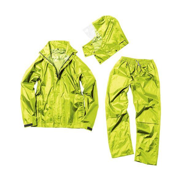 【特長】●中に着る服を選ばない新設計のレインスーツです。●高耐水圧。●視界を妨げないセーフティーフード仕様。
