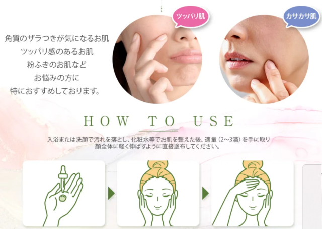 入浴または洗顔で汚れを落とし、化粧水等でお肌を整えた後、適量(2〜3滴)を手に取り、顔全体に軽く伸すように直接塗布してください。