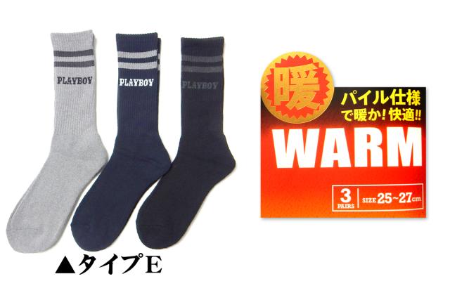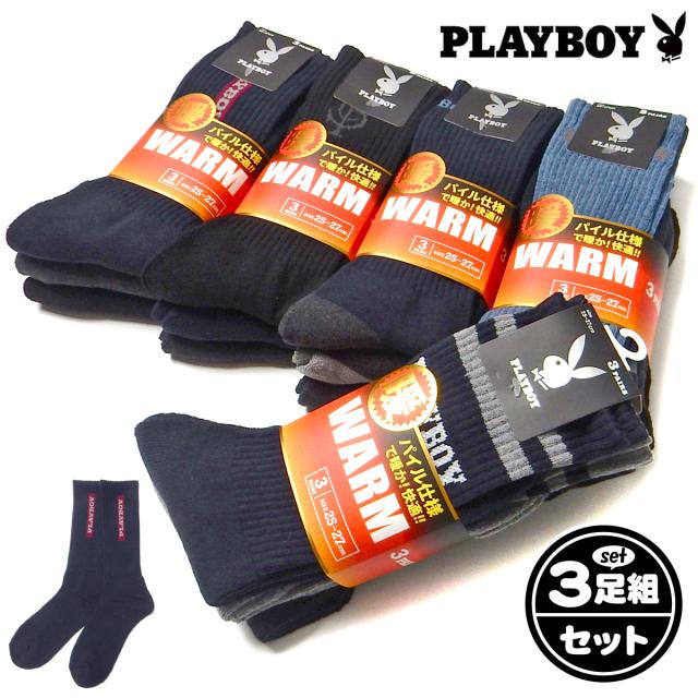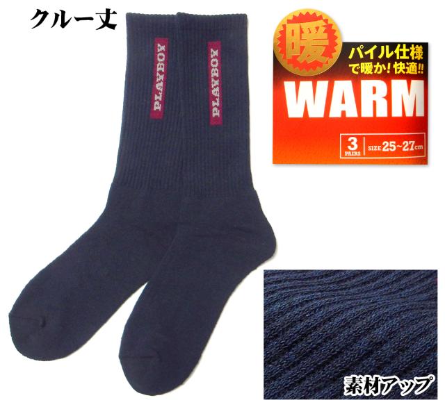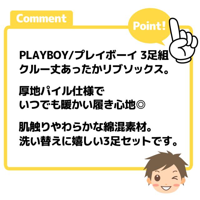【送料無料】3足組セット 紳士 メンズ クルー丈 リブ ソックス 靴下 PLAYBOY/プレイボーイ あったか素材 パイル仕様 厚地 25-27cm yg-2721【メール便対応】
