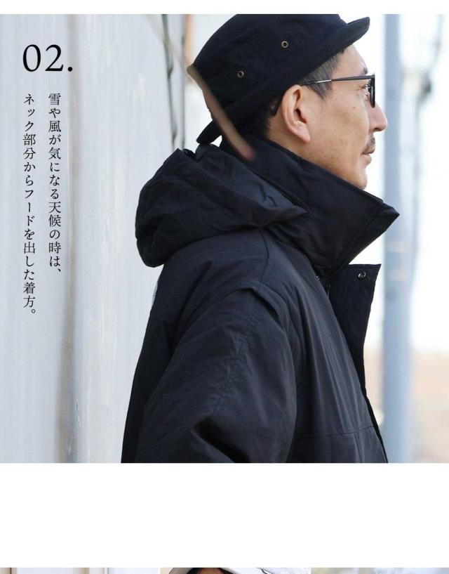 2.雪や風が気になる天候の時は、ネック部分からフードを出した着方。