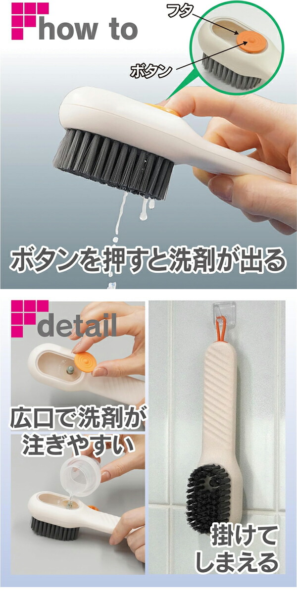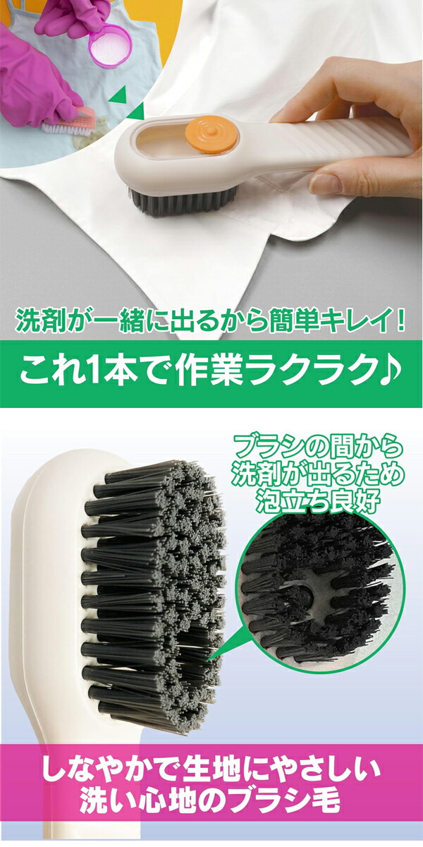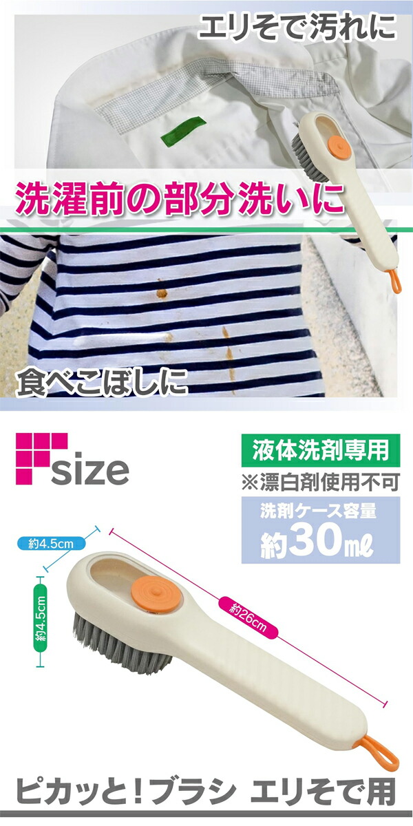 ◆エリそで、食べこぼし等、洗濯前の部分的な汚れ落としに便利な衣類用ブラシです。 ◆ボタンを押すと欲しい量だけピンポイントでブラシの間から洗剤が出てきます。 ◆容量約30mlの洗剤ボックス付き。 ◆こしのある柔らかな毛質で生地を傷めずこすり洗いが可能。 ◆本数の多い高密度ブラシで繊維の奥に入り込んだしつこい汚れもしっかり掻き出します。 ◆ワイシャツなどの予備洗いにおすすめです。 ◆壁掛けで収納できるフック紐が付属。衛生的に収納できます。 |
