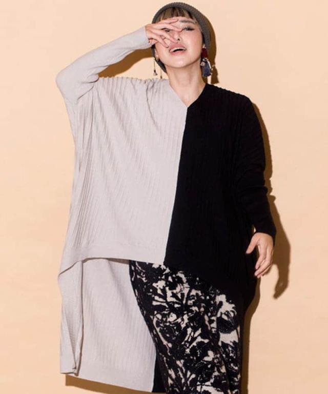 オーバーサイズながら、Vネックやロングリブ袖が、着痩せ効果の高い1枚。