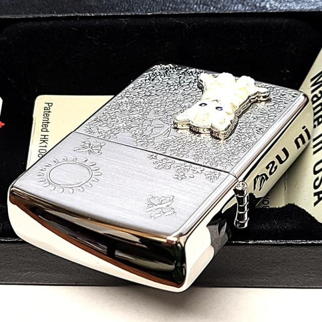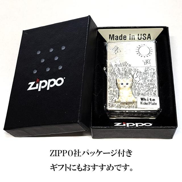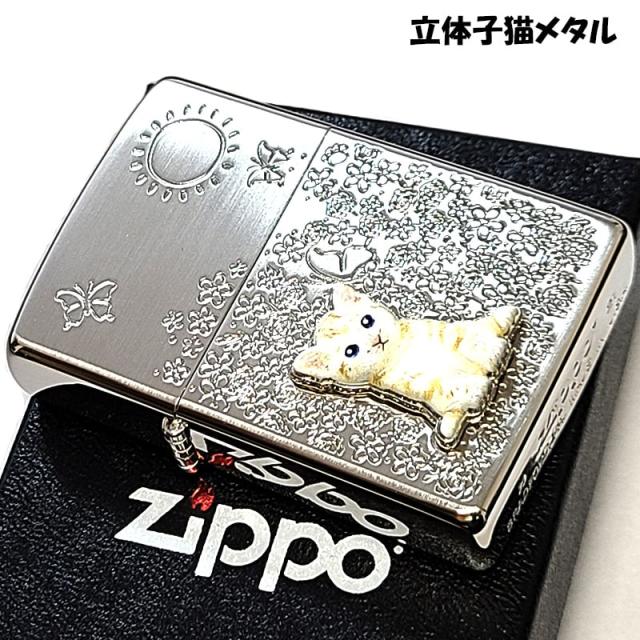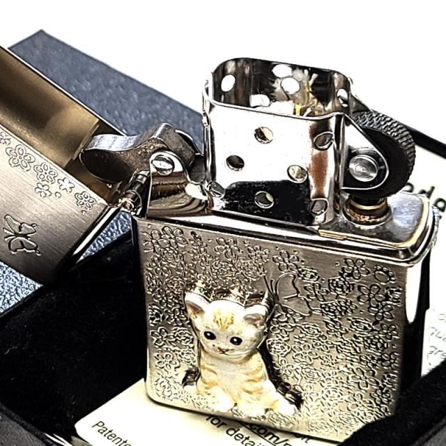 ZIPPO ライター ネコ メタル 花柄 ジッポ 猫 可愛い シルバー ねこ フラワー おしゃれ ホワイトニッケル 彫刻
