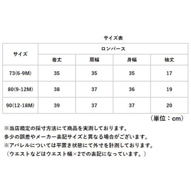 | サイズ | [ベビー] ・73cm(6-9M) ・80cm(9-12M) ・90cm(12-18M) ※サイズについて詳細は、商品画像の中にあるサイズ表をご覧くださいませ。 |