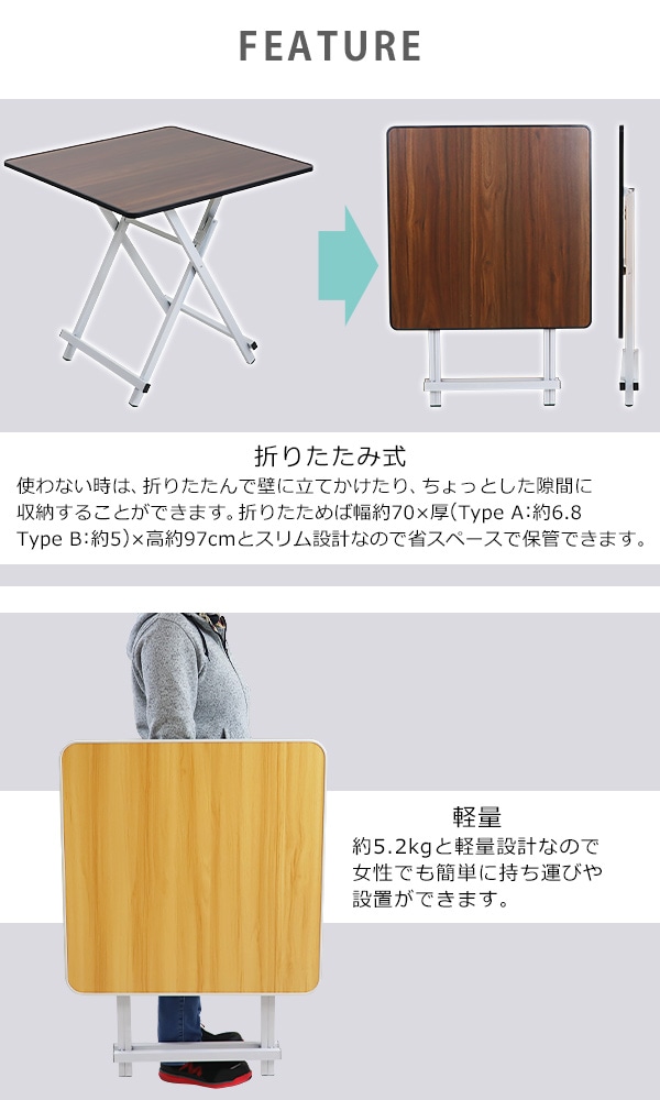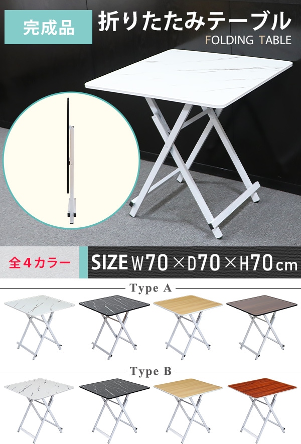 折りたたみテーブル ダイニングテーブル 約幅70×奥行70×高さ70cm 耐荷重約70kg 完成品 組み立て不要 合板 軽量 コンパクト 折りたたみ式 折りたたみデスク パソコンデスク 木製天板 テーブル 食卓 勉強机 作業机 ワークテーブル ウォールデスク fldtbltc097070