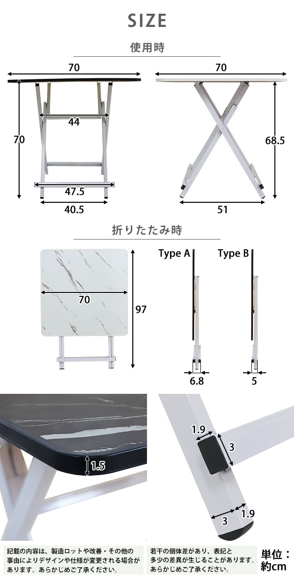 | 本体寸法 | 使用時:W約 70×D約 70×H約 70(cm) 折りたたみ時 Aタイプ:W約 70×D約 6.8×H約 97(cm) Bタイプ:W約 70×D約 5×H約 97(cm) |
