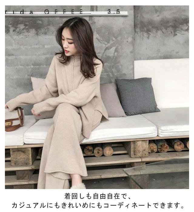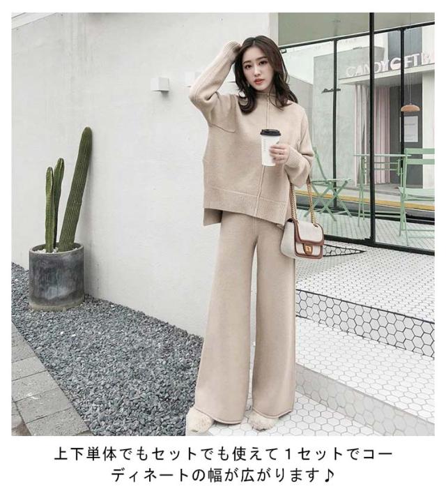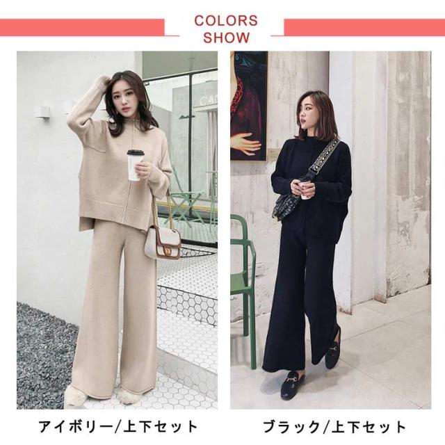 セットアップ ニットセットアップ 上下セット 秋冬 レディース パンツセットアップ フェミニン ニット 長袖 タートルネック ゆったり 無地 体型カバー ワイドパンツ ウエストゴム ニットセーター 可愛い お洒落 カジュアル 上品 セットアップ シンプル ゆったり