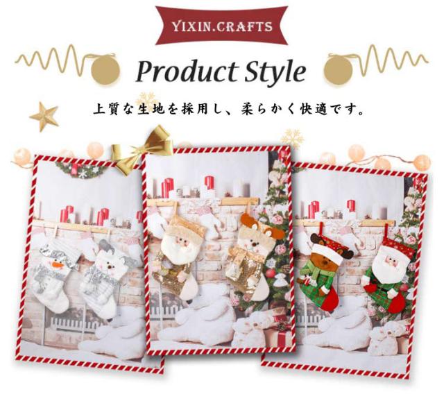 | 幸せで美しいクリスマスを生成するために繊細な飾りソックスです。 上質な生地を採用し、柔らかく快適です。 大きな開口と広い内部空間は、様々なギフトに適しています。 便利な掛け紐が付いております。ドア、壁、窓ぎわ、クリスマスツリー、ベッドサイトなどお好きなところにクリスマス飾りとしてかけることができます。 | |