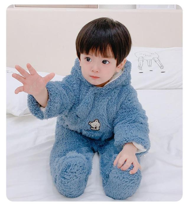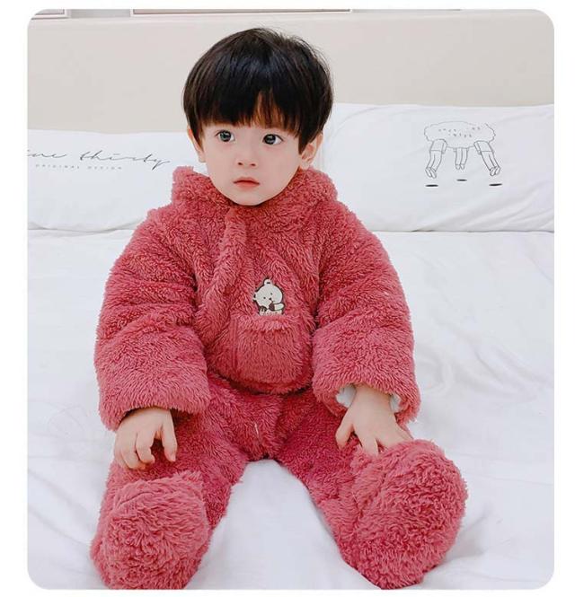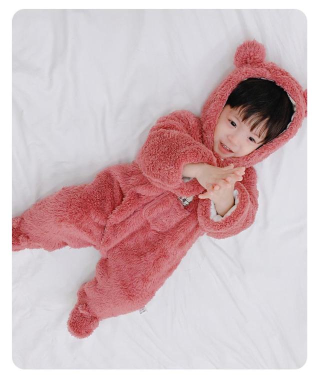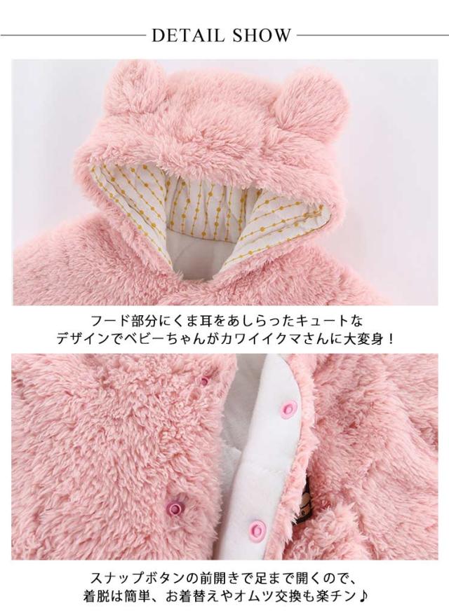 | 赤ちゃんの頭からつま先まですっぽりと包んでベビーロンパースです。 ふわふわ軽く暖かい着心地!もこもこのボアで見た目にもあったかいです。 フード部分にくま耳をあしらったキュートなデザインでベビーちゃんがカワイイクマさんに大変身! スナップボタンの前開きで足まで開くので、着脱は簡単、お着替えやオムツ交換も楽チン♪ お出かけ時のアウターとしてはもちろん、ルームウェアやパジャマとしてもお使いいただけます。 | |