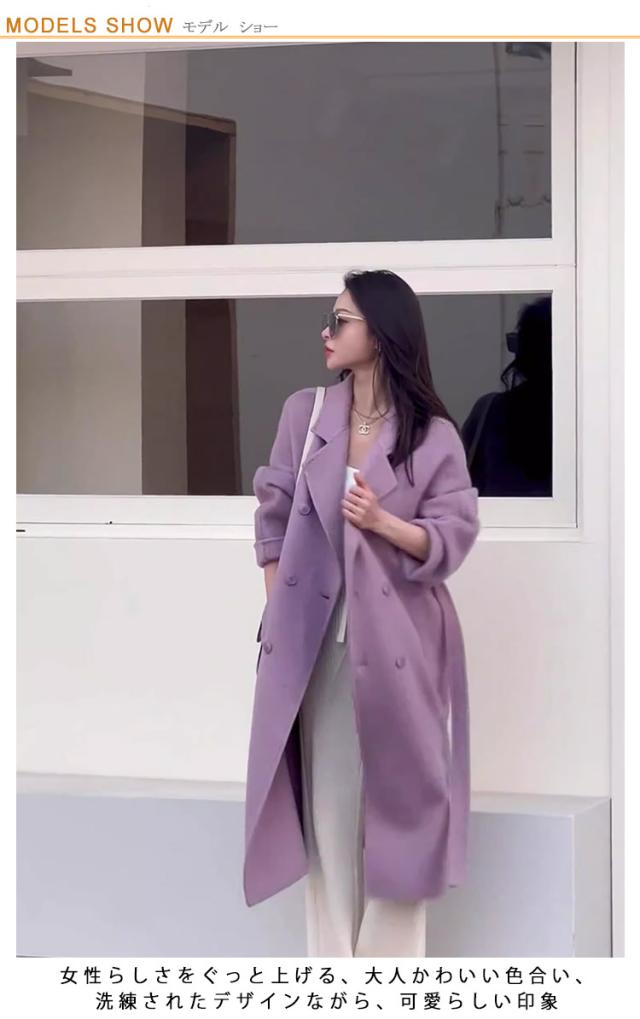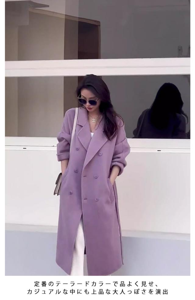 上品 ロングコート お洒落 ロング レディース 羽織り ミモレ丈 アウター コート フェイクウールコート チェスターコート ダブルボタン こなれ感 パープル 紫 ロングチェスターコート 秋冬 あったか