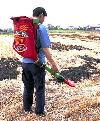 - まくぞーくんDXの特長・背袋に肥料を入れ、背負って散布ノズルを前後に振れば自然落下で散布できます。