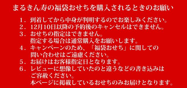 注意事項 当店のおせち料理は細心の注意を払って製造をしておりますが、ご高齢の方やお子様におかれましては、お餅系やえびくるみなどの一部商品はお召し上がりいただく際に、少量ずつ食べることでより安全にお召し上がりいただけます。