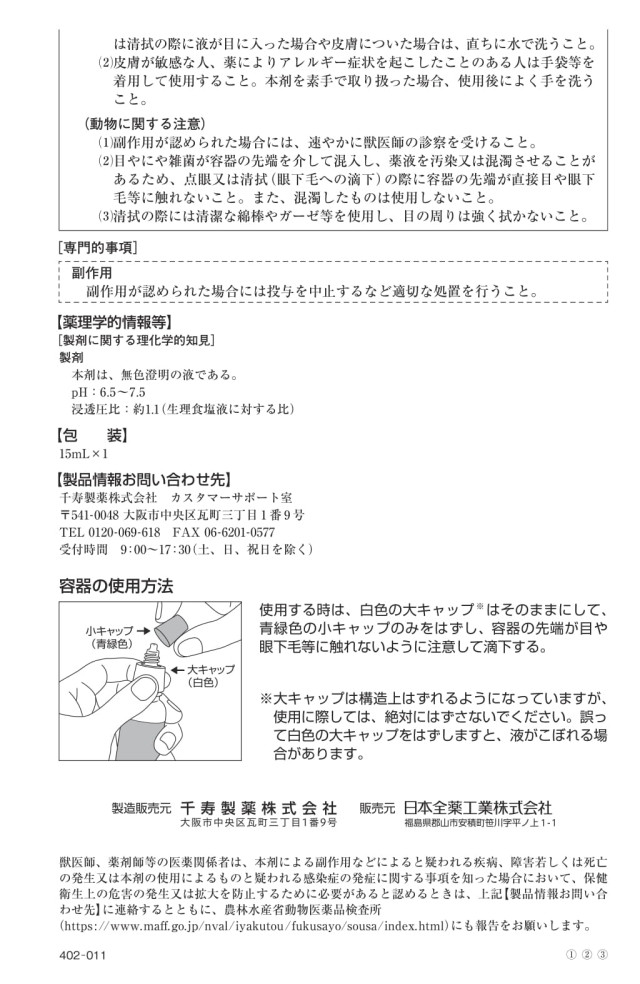 清拭:眼下毛の汚れの清拭用法及び用量 点眼:1日3〜6回、1回1〜3滴の範囲で点眼する。