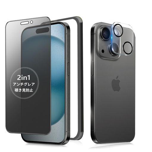 【2in1・多機能】 新技術を取り入れた2in1保護フィルムは、アンチグレア&覗き見防止機能を兼ね備えています。画面操作時の手触りをさらに改良し、より滑らかでサラサラな使い心地を実現しました。 【対応機種】 iPhone15 用(6.1インチ対応)。【パッケージ内容】 iPhone 15 ガラスフィルム * 1枚セット + iPhone15 カメラフィルム * 1枚セット + ガイド枠 * 1枚。