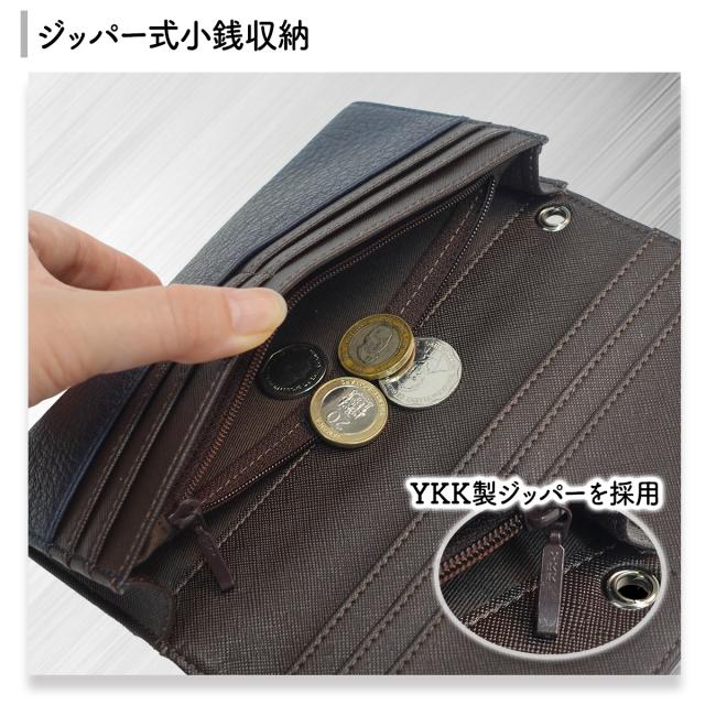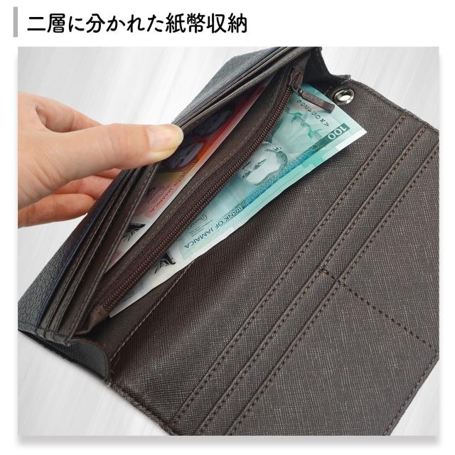 二層に分かれた紙幣収納、ジッパー式の小銭収納に加え、カードやレシート類を収納できる多段カードポケットを設けています。