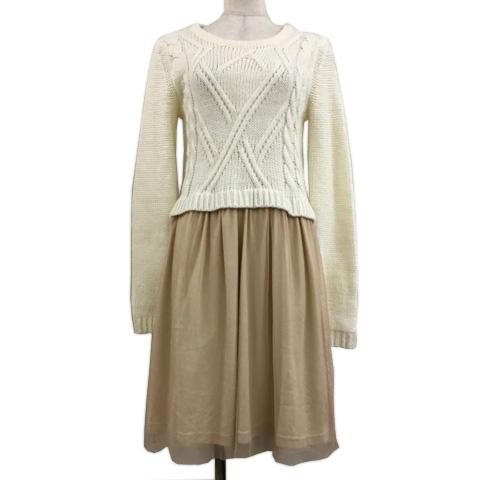 【中古】ロペピクニック ワンピース ニット フレア ミニ 切替 チュール ケーブル編み タック 長袖 38 白 ベージュ