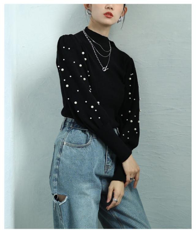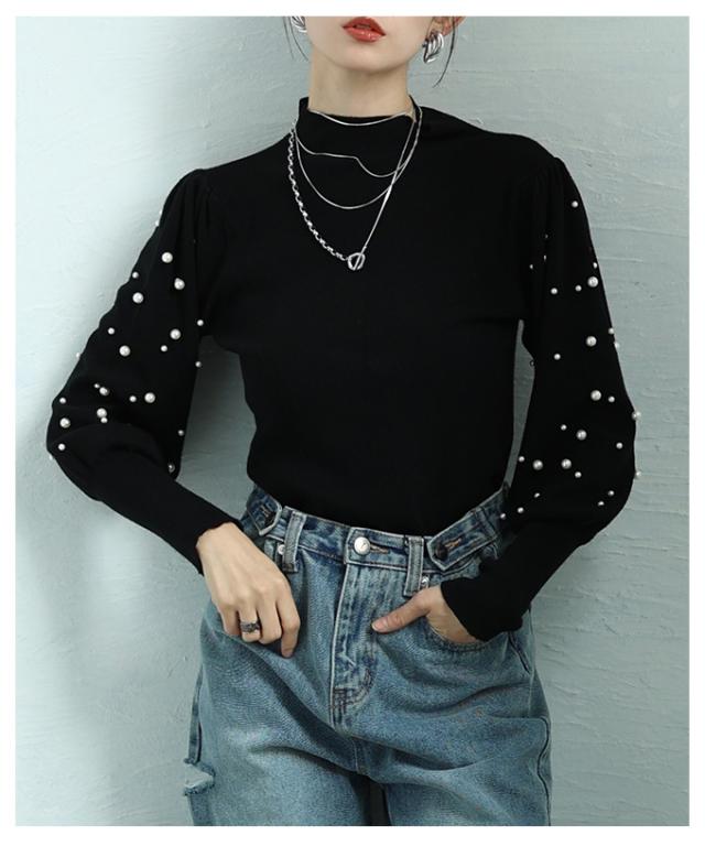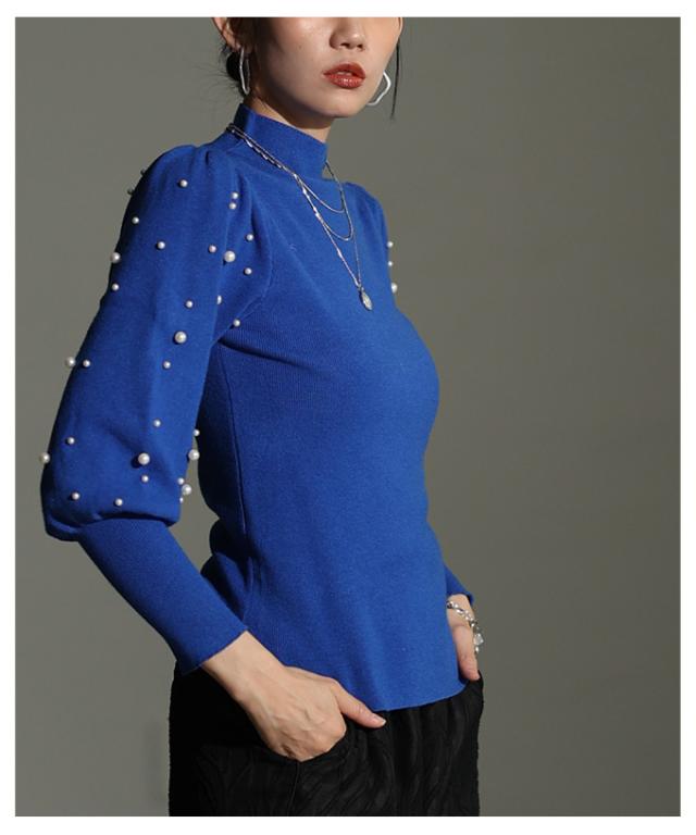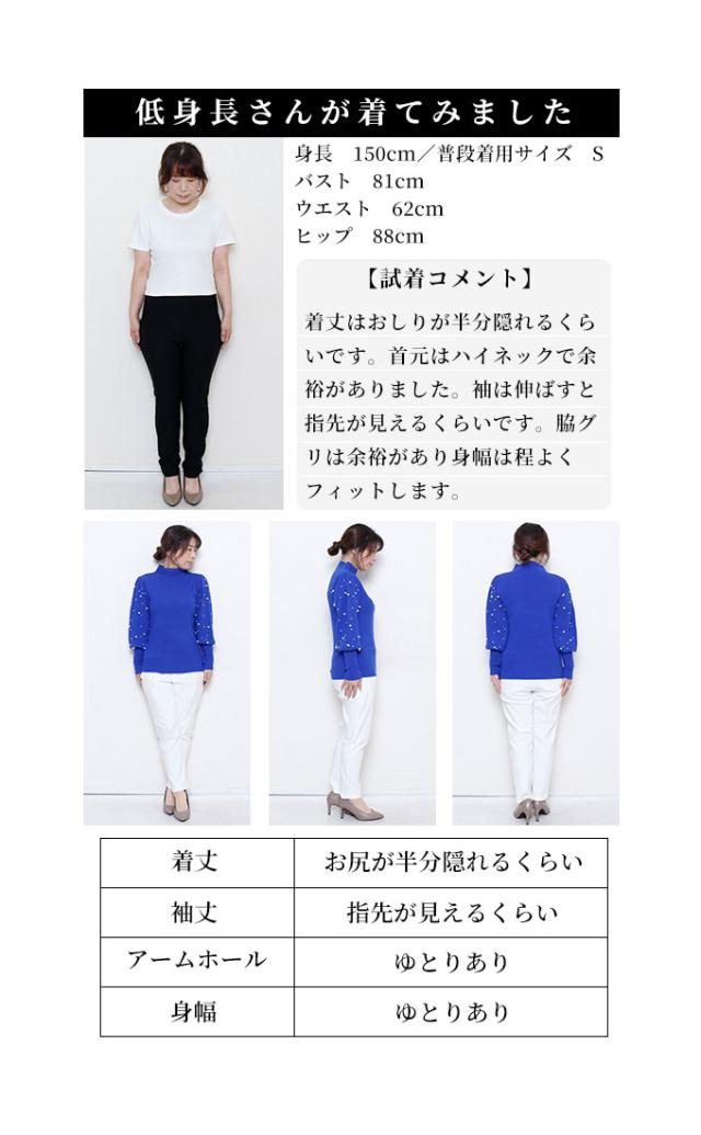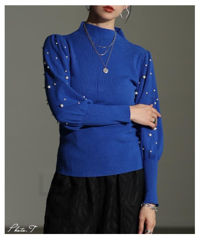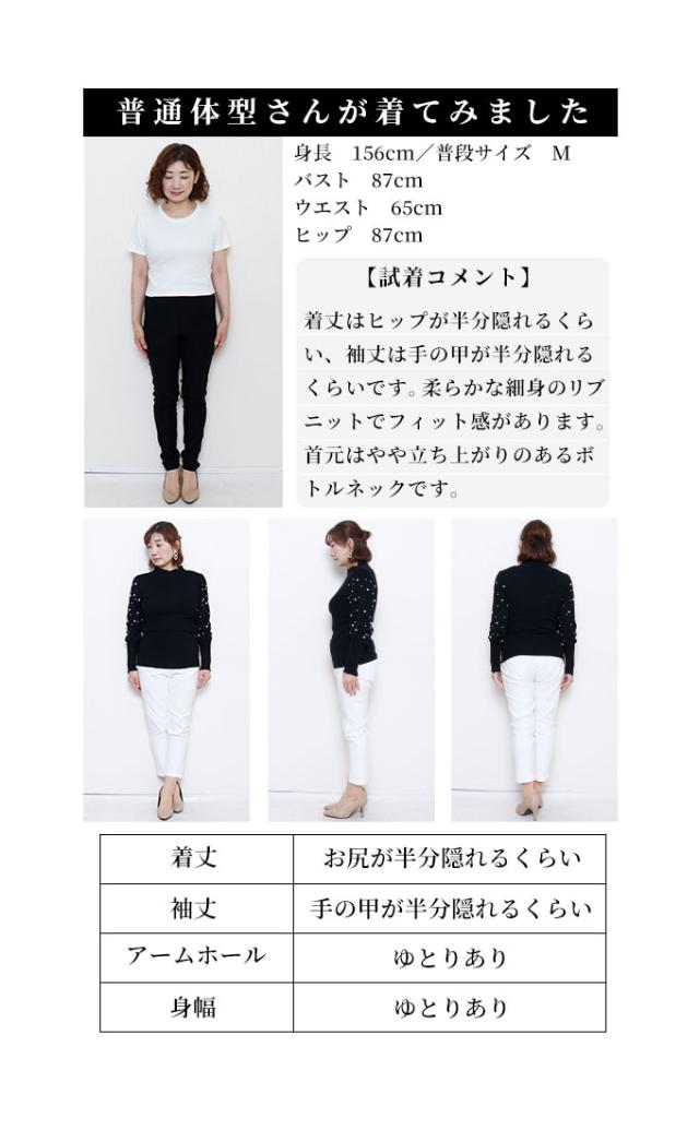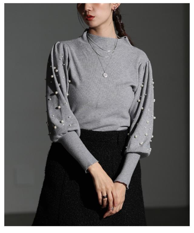 着丈はヒップが半分隠れるくらい、袖丈は手の甲が半分隠れるくらいです。柔らかな細身のリブニットでフィット感があります。首元はやや立ち上がりのあるボトルネックです。袖はふんわりしていて大小のパールが散りばめられ華やかです。肘下中間辺りから長めのリブ切り替えで手首がほっそり見えます。