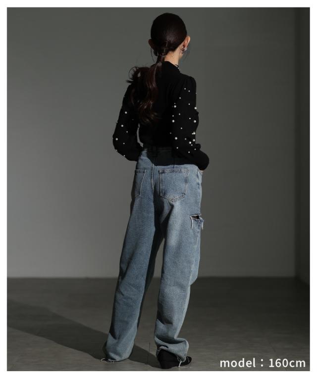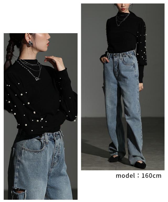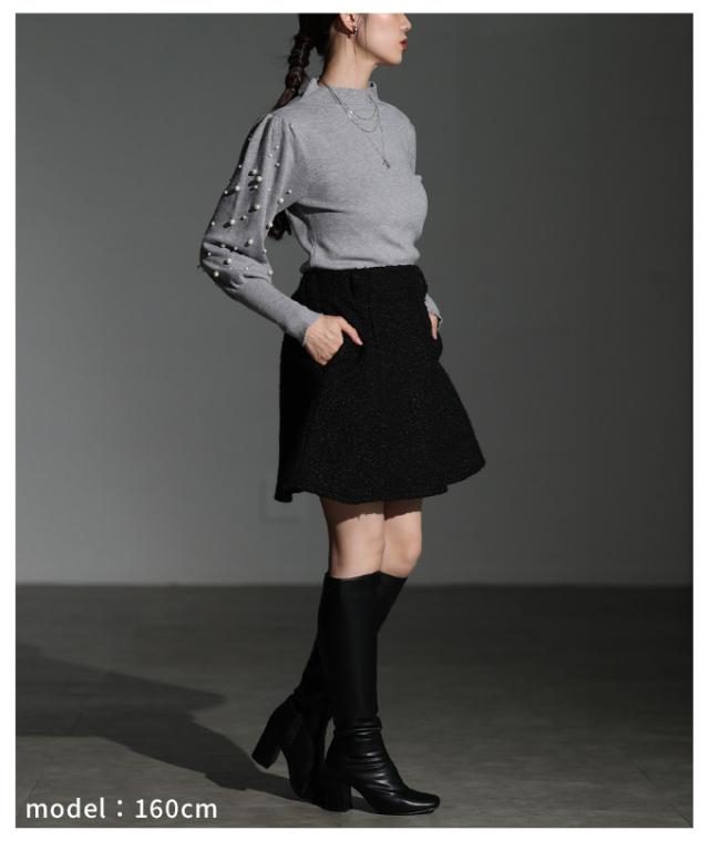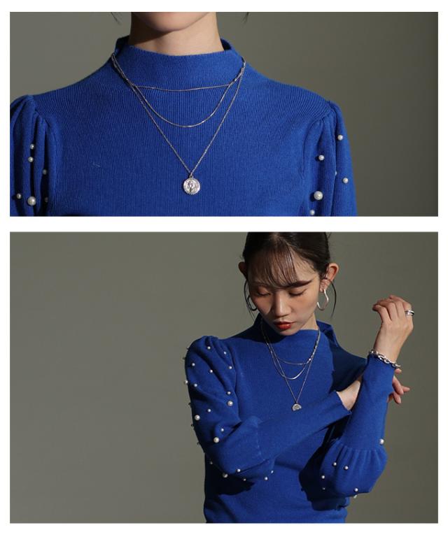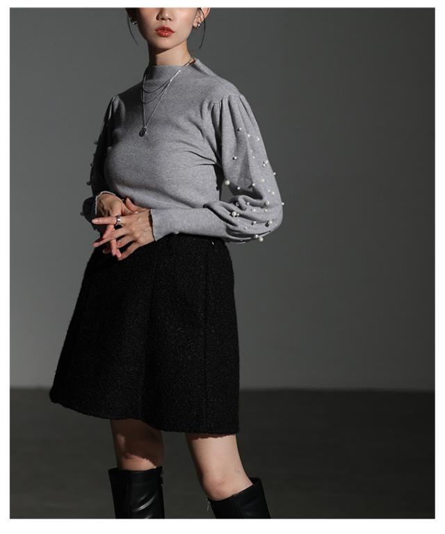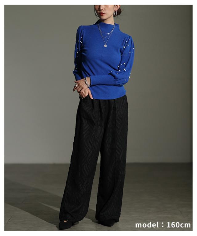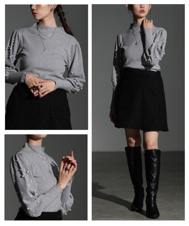 着丈はヒップが半分隠れるくらい、袖丈は手の甲が半分隠れるくらいです。柔らかな細身のリブニットでフィット感があります。首元はやや立ち上がりのあるボトルネックです。袖はふんわりしていて大小のパールが散りばめられ華やかです。肘下中間辺りから長めのリブ切り替えで手首がほっそり見えます。