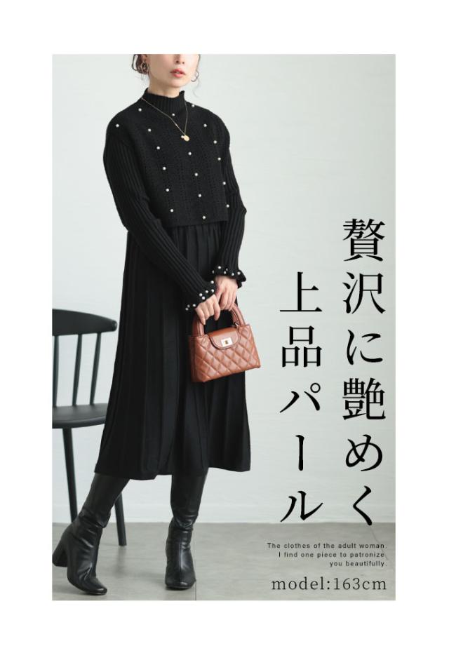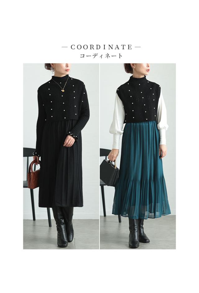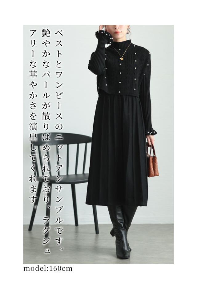 冬新作 パールベストとワンピースのニットアンサンブル レディース ファッション セットアップ アンサンブル ワンピース ベスト 大人可愛い 40代 レディースファッション 50代女性 ファッション 60代 ミセスファッション サワアラモード sawaalamode otona alna-0008