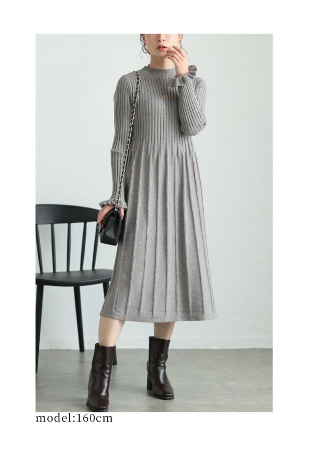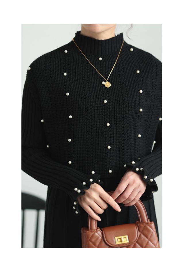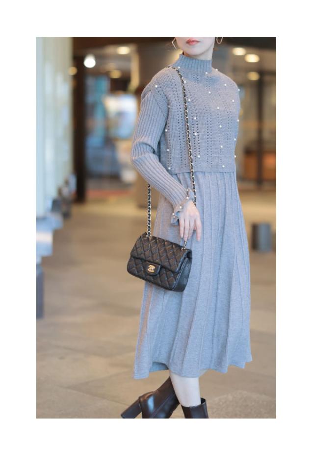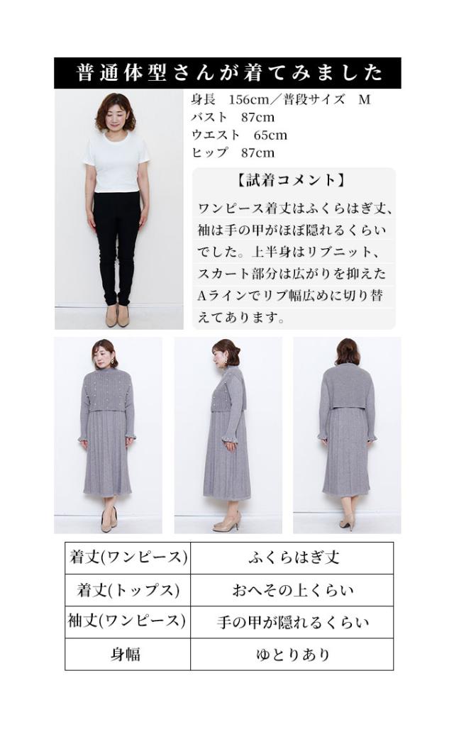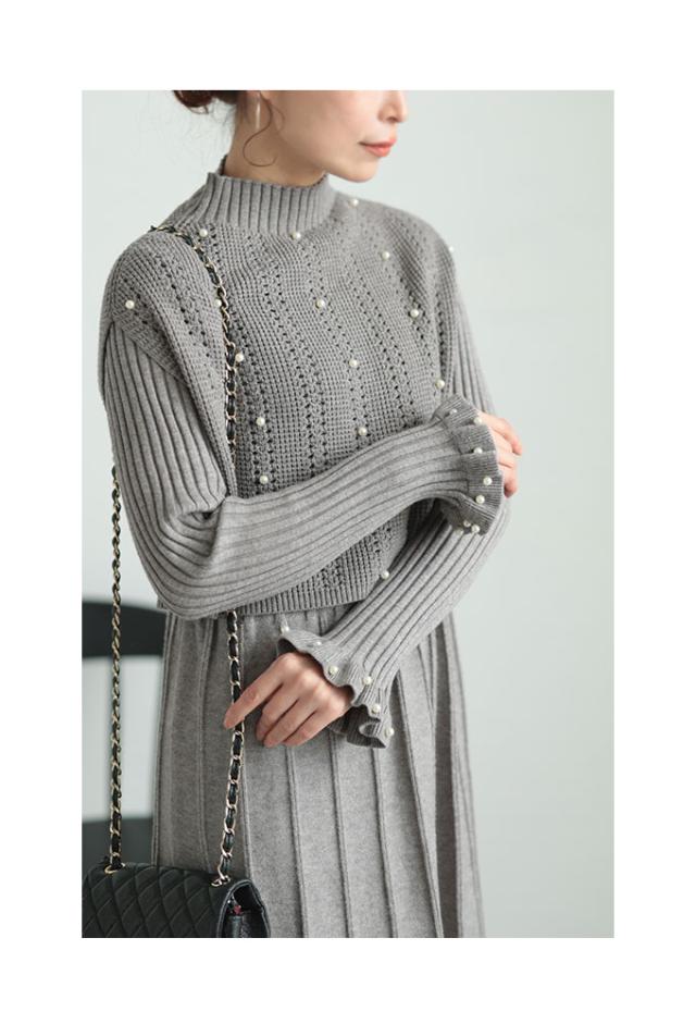 ワンピース着丈はふくらはぎ丈、袖は手の甲がほぼ隠れるくらいでした。上半身はリブニット、スカート部分は広がりを抑えたAラインでリブ幅広めに切り替えてあります。首元はやや立ち上がりがありフィットします。袖口はパールを散りばめた広がりのあるデザインで手元がキレイに見えます。トップス着丈はおへそのやや上のショート丈でバランス良く見えます。