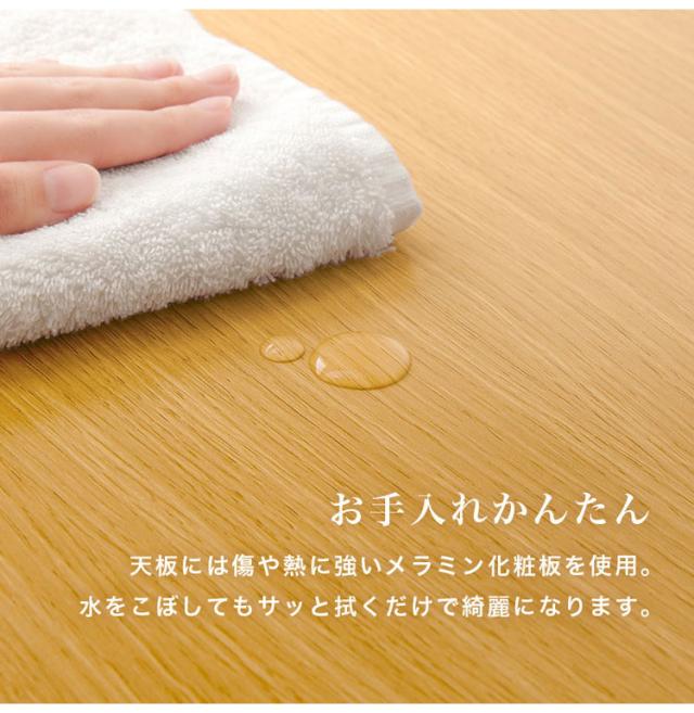 天板:合成樹脂化粧繊維(メラミン樹脂)、脚部:天然木(樺材)