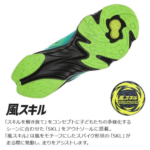 男の子の様々な潜在能力を解き放つ「スキルシューター」の「風スキル シップウ」。「スキルを解き放て」をコンセプトに子どもたちの多様化するシーンに合わせた「SKL」をアウトソールに搭載しており、踏み込む際の荷重によって「SKL」が発動。「風スキル」は風をモチーフにしたスパイク形状の「SKL」が走る際に発動し、走りをアシス。重さは21.0cmで片足約165g。