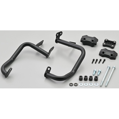 ※過度な転倒時には商品が破損する恐れがあります。※マットブラック塗装のため、飛び石やバイク保管用保護カバーとのすれ等で塗装がはがれる場合があります。※純正状態よりバンク角が減少する場合があります。ご注意ください。※単品装着の場合、Upper(46598)との連結ブラケットが残ります。残ってしまう連結ブラケットは、ハンドルクランプ用品を取り付けた際の、脱落防止用のストラップホールとして使用可能です。※社外品EXパイプに交換した場合、干渉することがあります。(SP TADAO社「Power Box PIPE」は同時装着が可能です。)