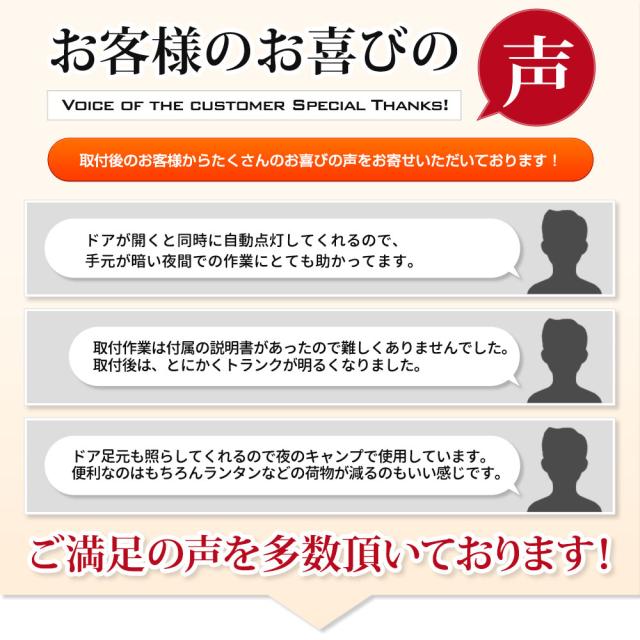 - 同梱品の不足がありましたが、しっかり対応していただけました。 取付は若干手間取りました。 純正だと小さな明かりしかなく、暗くて不便でしたがこの商品をつけて大正解。 明るくなり荷物の出し入れに役立ちます...